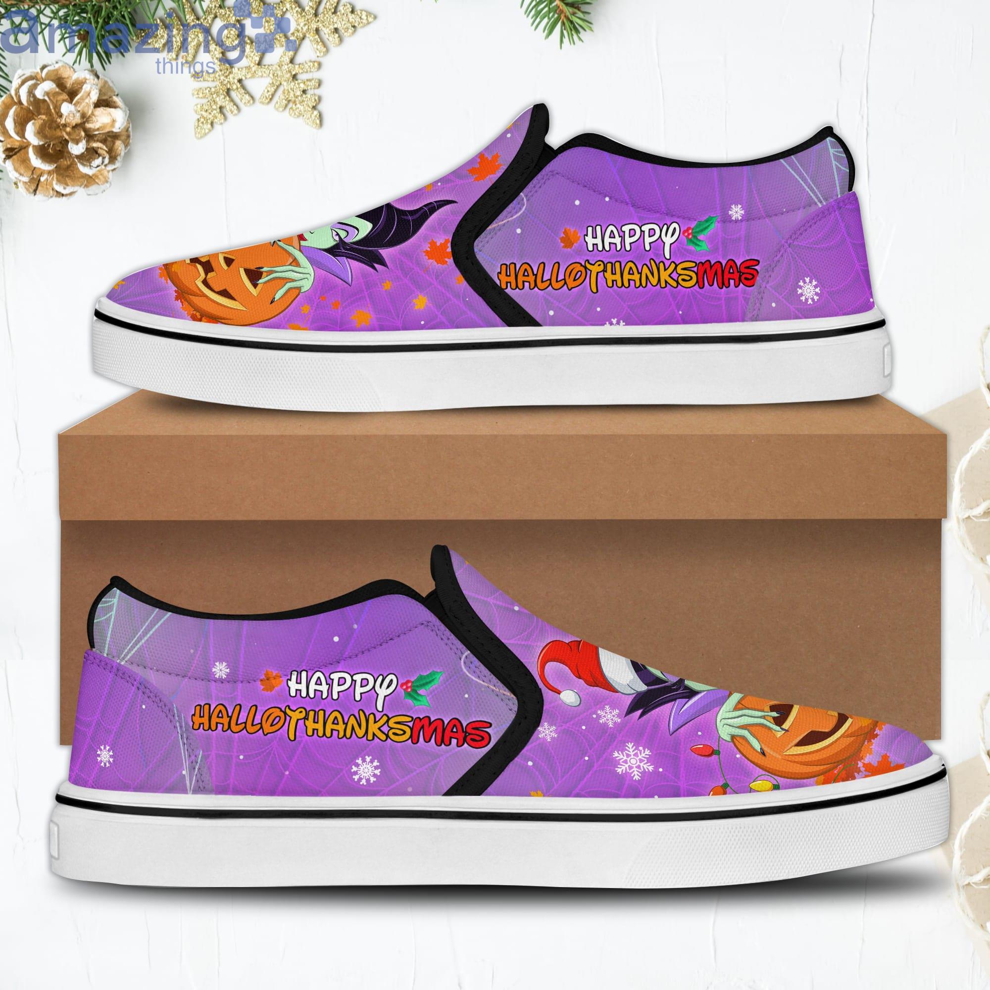 Happy Hallothanksmas Maleficent Purple Disney Villains Halloween Thanksgiving Christmas Slip On Shoes Information: