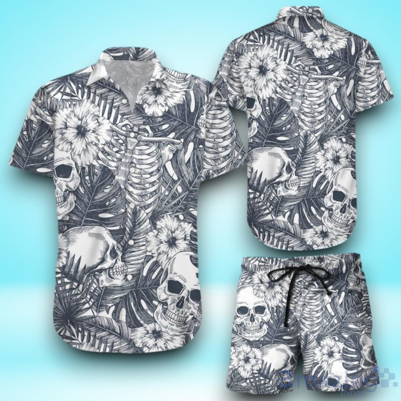 Crafted from premium quality materials, this Hawaiian shirt and shorts set combines comfort and style effortlessly. The cool grey backdrop beautifully contrasts with the vibrant skull print, creating a unique and eye-catching design that is sure to turn heads wherever you go.