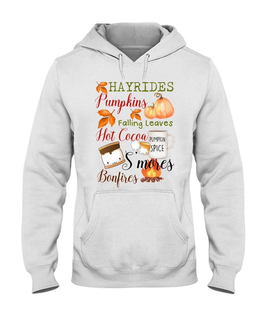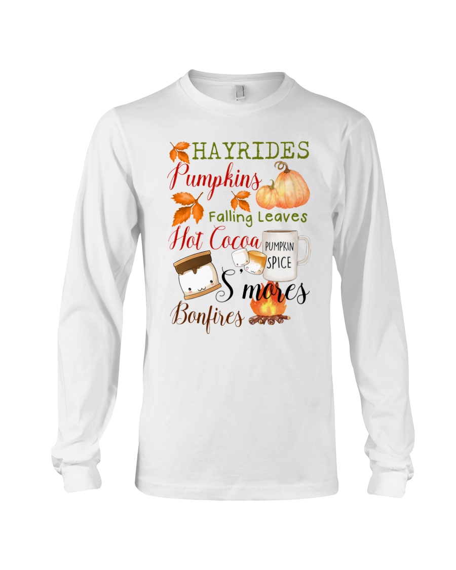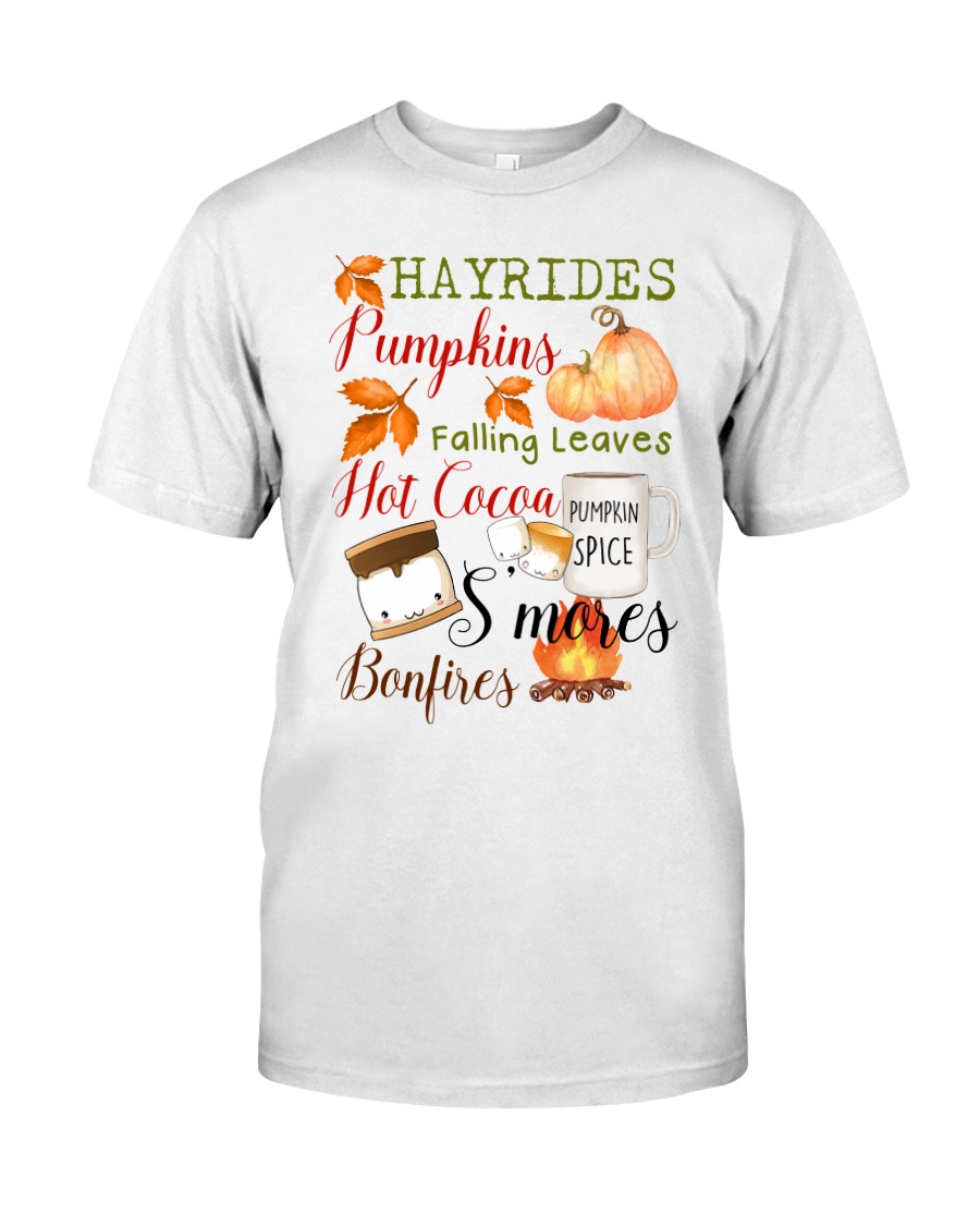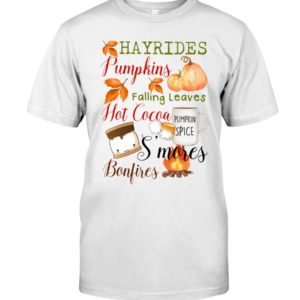 Embrace the Essence of Autumn with the Hayrides Pumpkins Falling Leaves Hot Cocoa Pumpkin Spice S’mores Bonfires Shirt