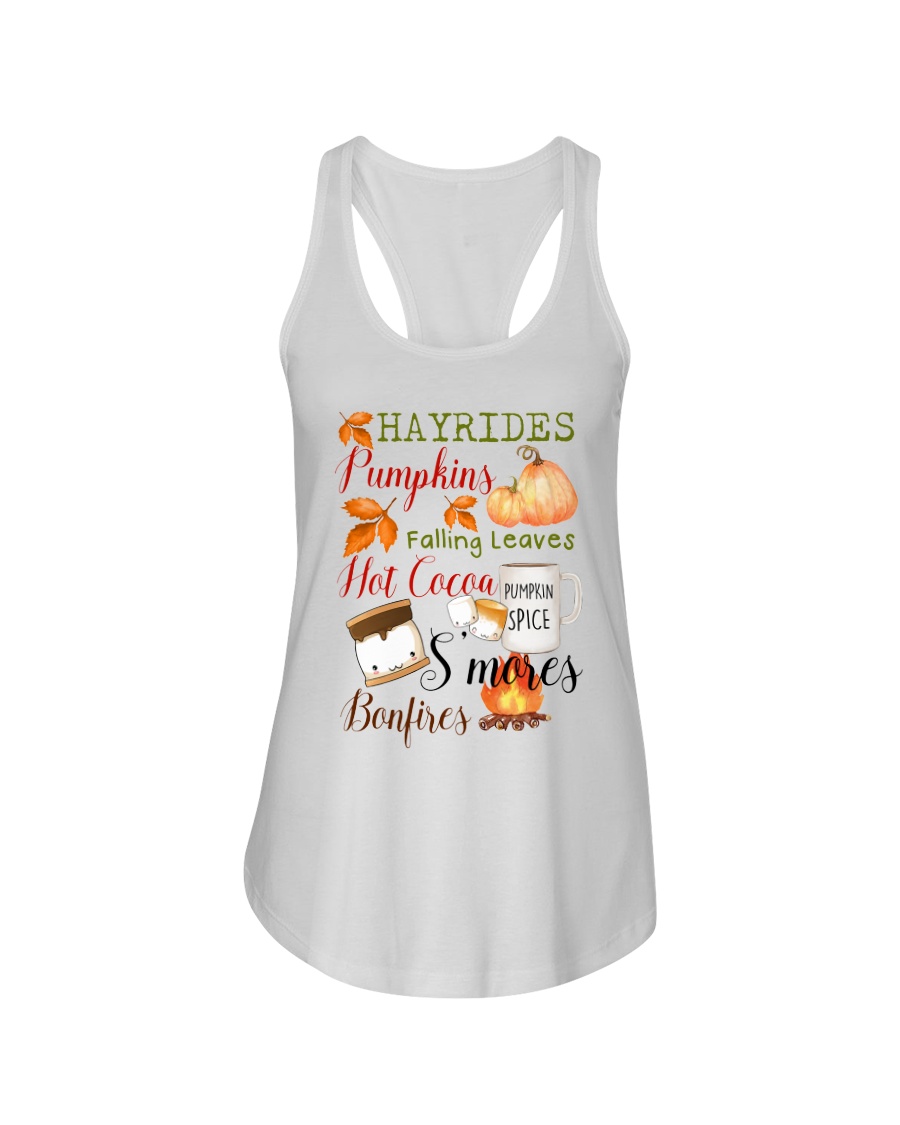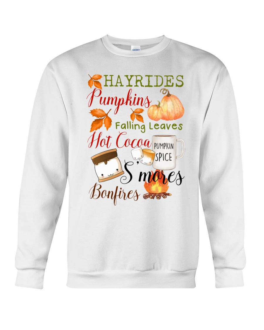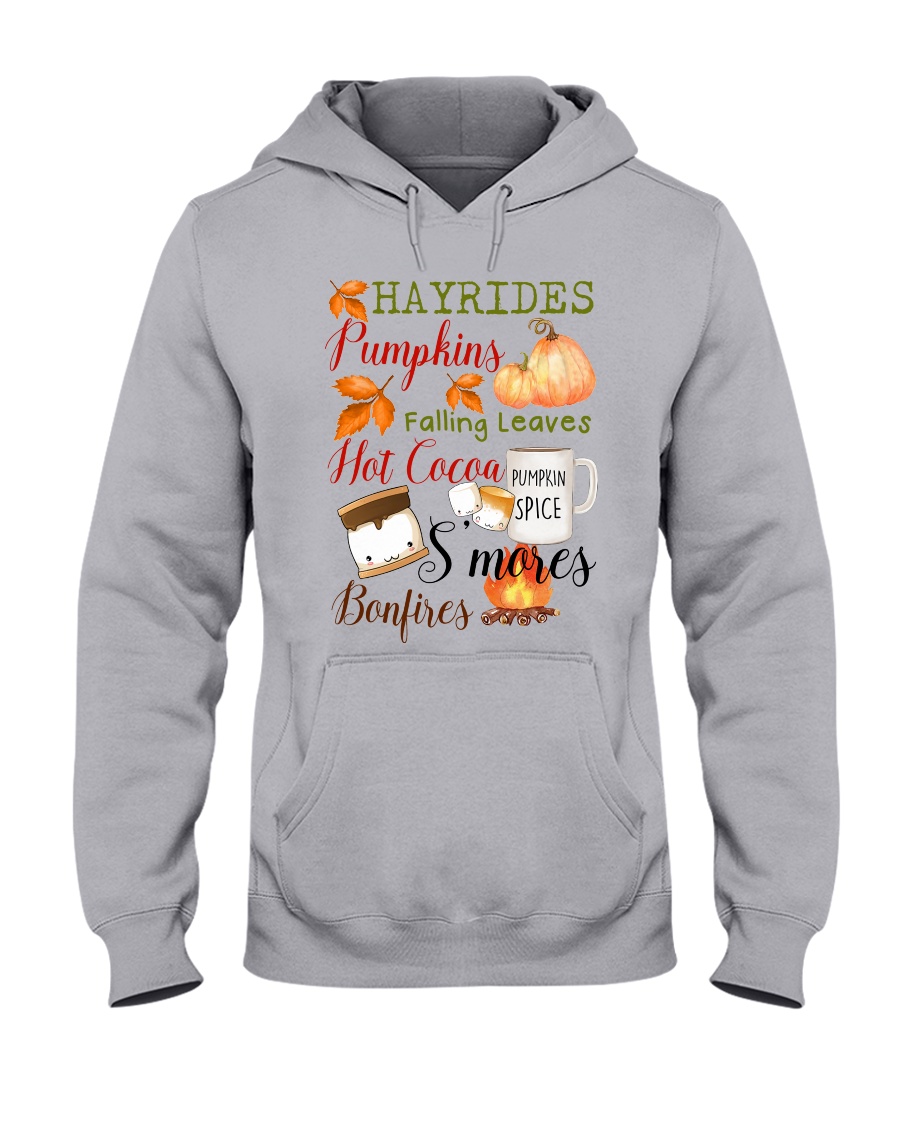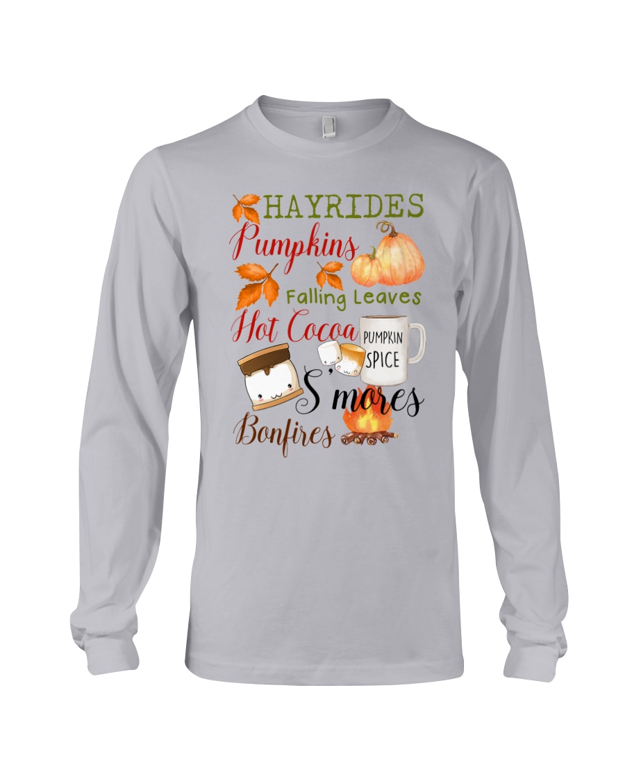 Embrace the Essence of Autumn with the Hayrides Pumpkins Falling Leaves Hot Cocoa Pumpkin Spice S’mores Bonfires Shirt
