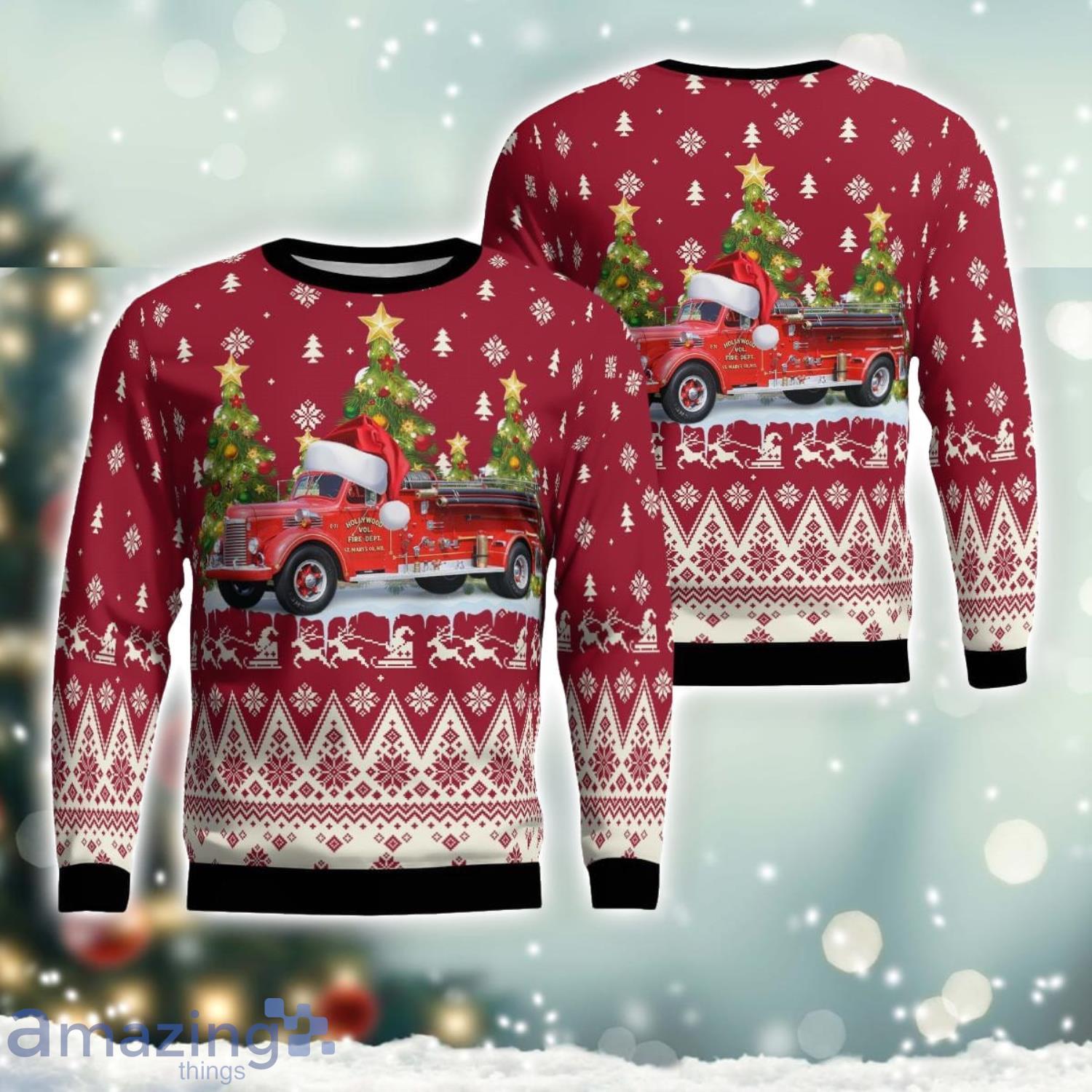 Some of the Hollywood, Maryland, Hollywood Volunteer Fire Department Antique Engine AOP Ugly Sweater Christmas Holiday Gift photos
