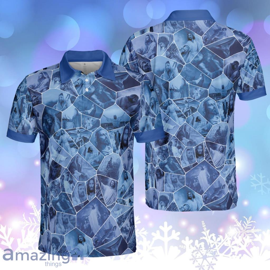 Holy Blue Stained Glass Polo Shirt, Blue Jesus Gallery Polo Shirt, Best Christian Shirt For Men