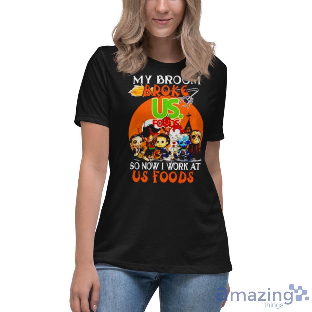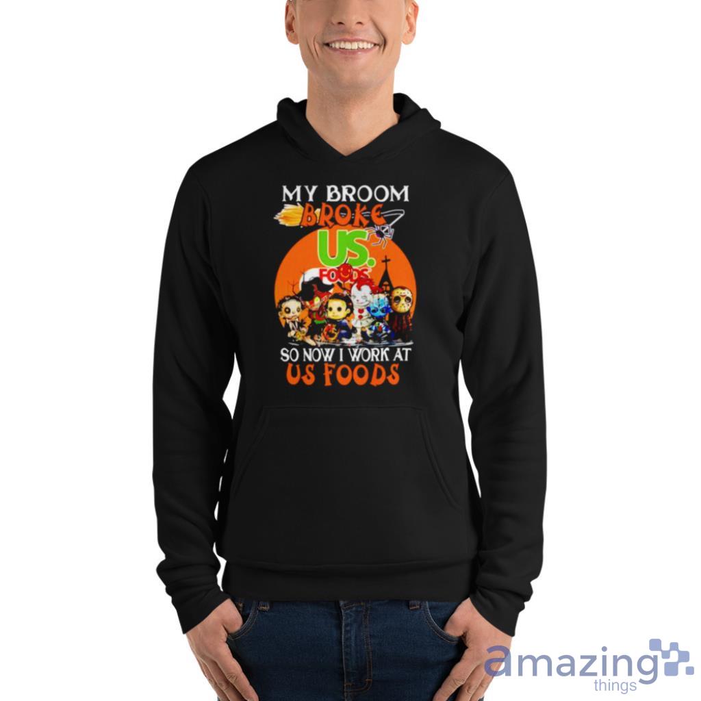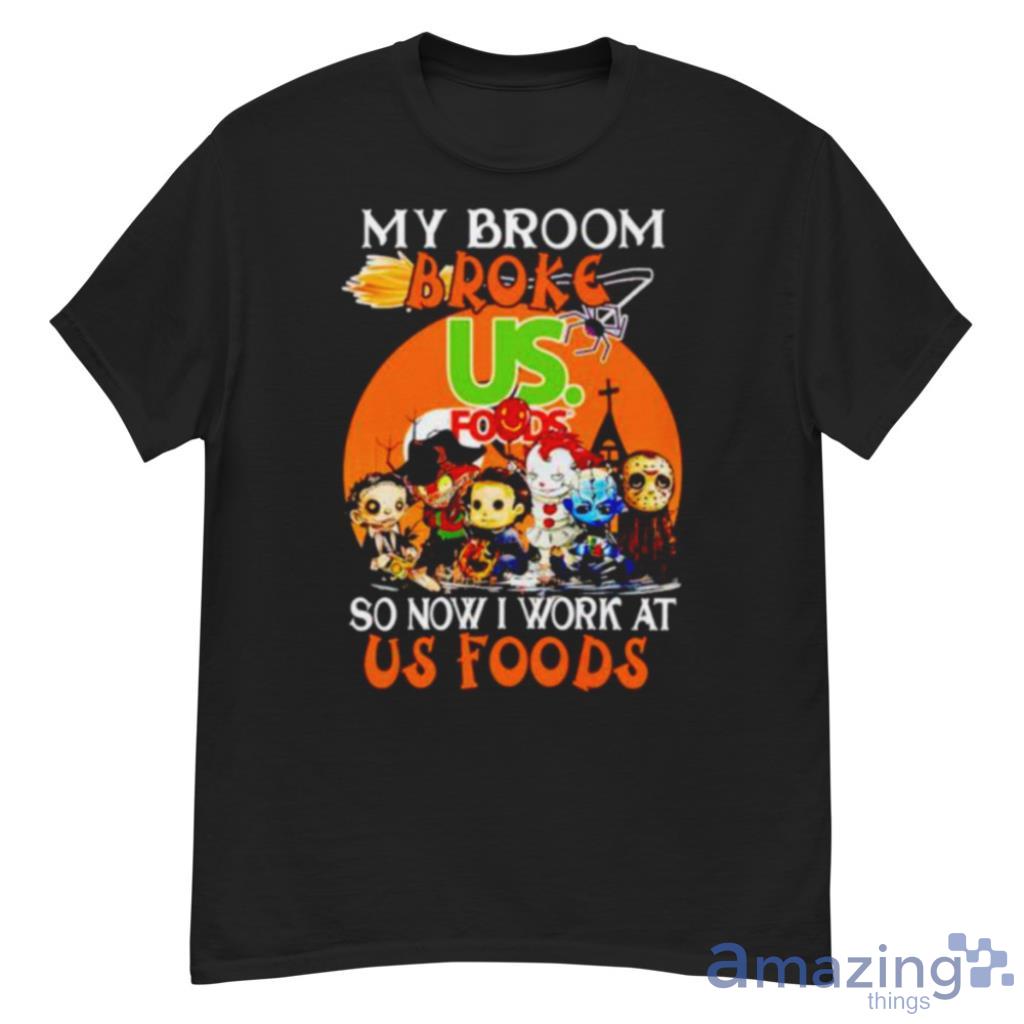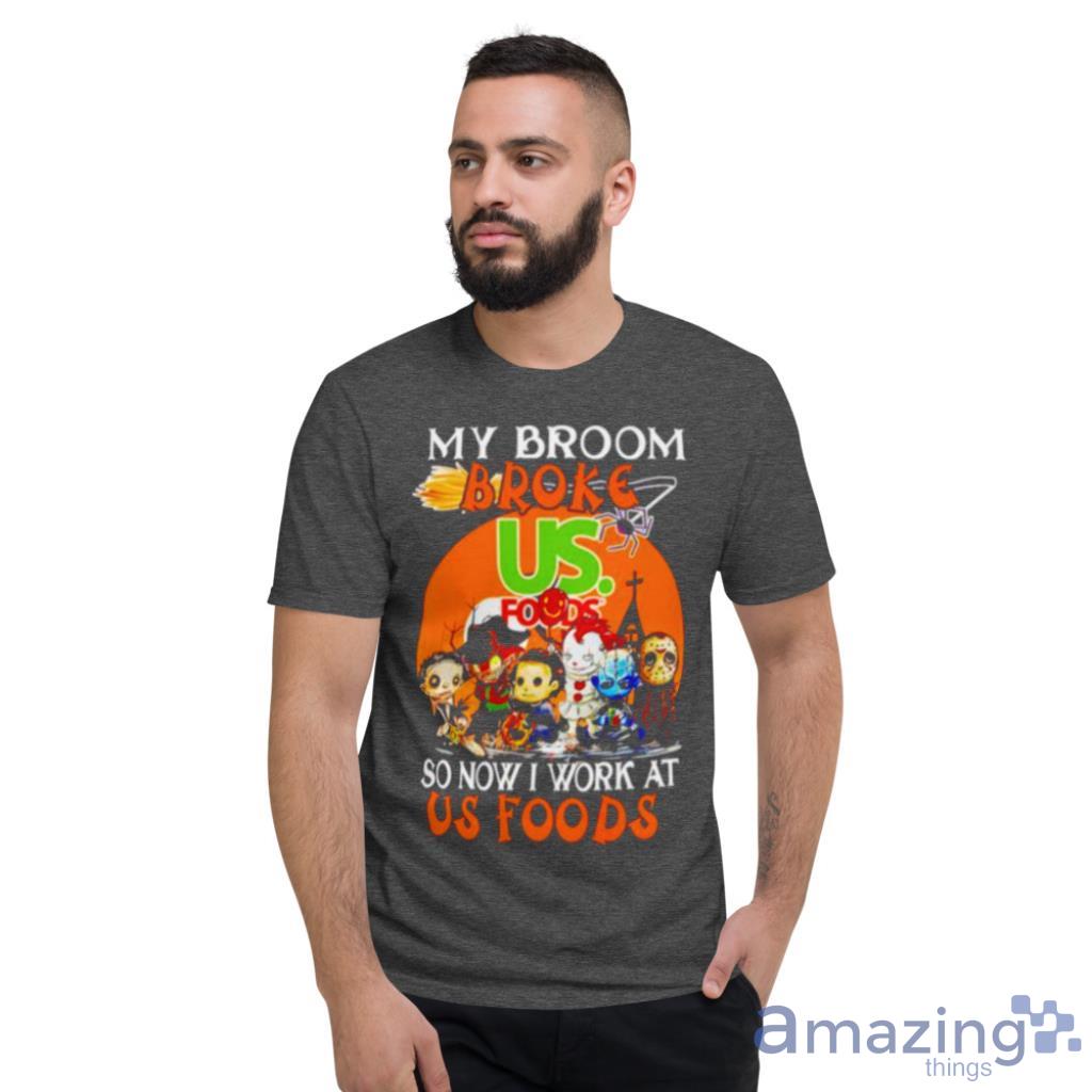 The clever slogan, “My Broom Broke So Now I Work At Us Foods,” adds a touch of humor and creativity to your outfit. It’s the perfect conversation starter and is sure to elicit smiles and laughter from fellow horror fans.