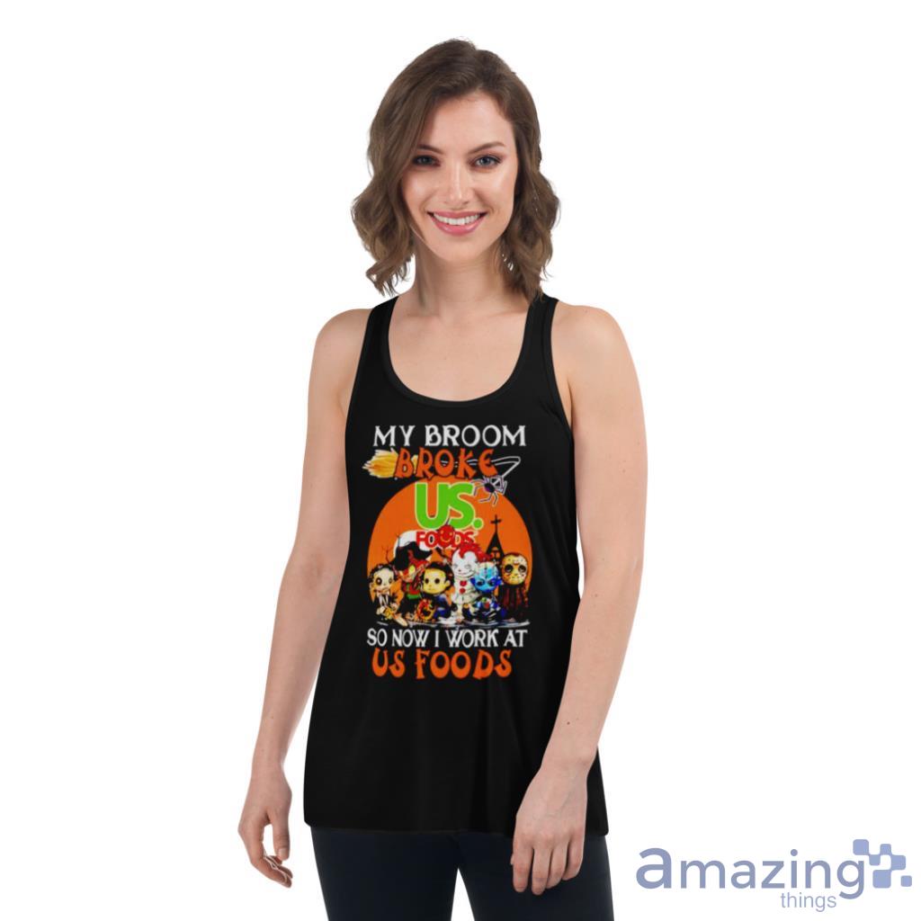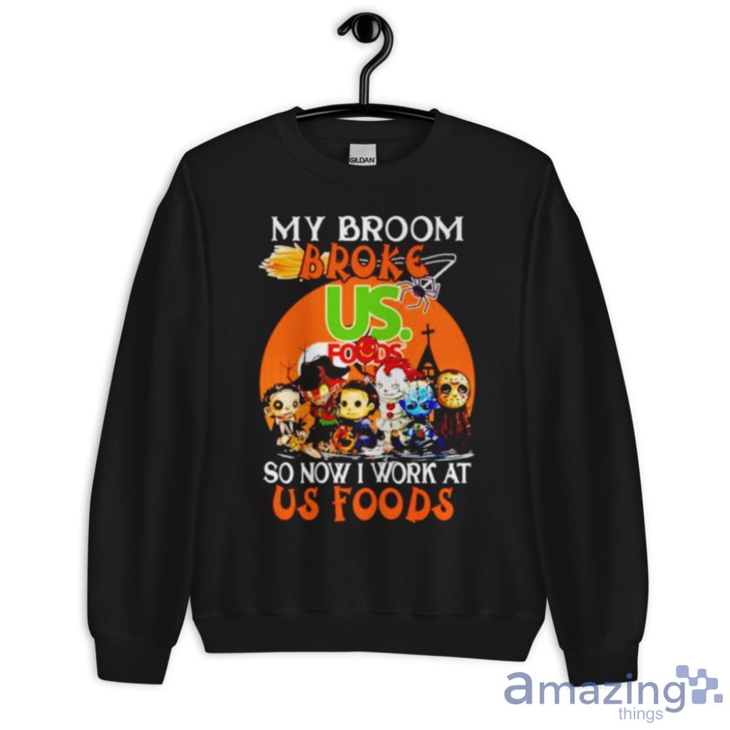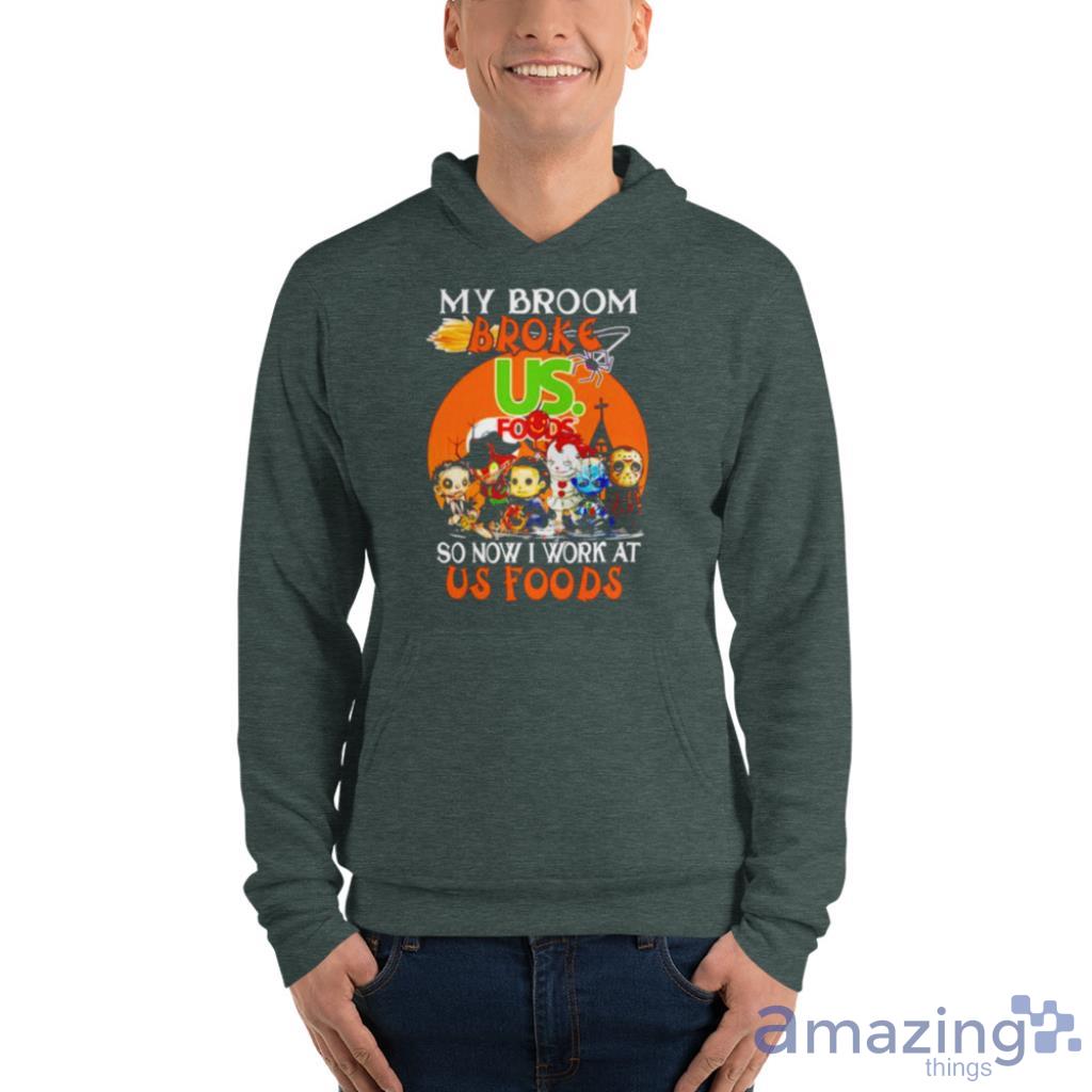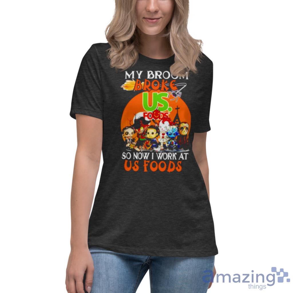 The clever slogan, “My Broom Broke So Now I Work At Us Foods,” adds a touch of humor and creativity to your outfit. It’s the perfect conversation starter and is sure to elicit smiles and laughter from fellow horror fans.