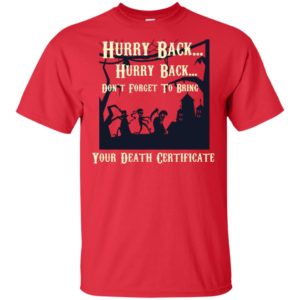 Whether you’re heading to a casual gathering, a themed event, or just running errands, the Hurry Back Don’t Forget to Bring Your Death Certificate Shirt is guaranteed to turn heads and elicit reactions.