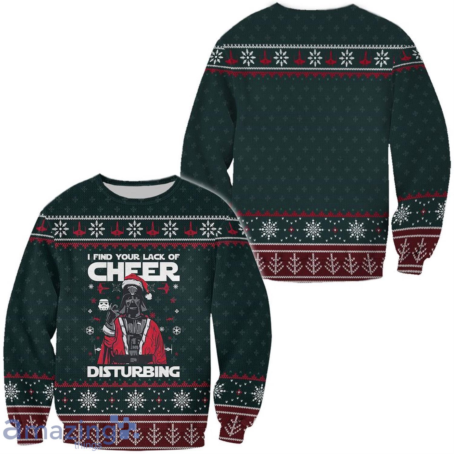 Crafted with utmost care, this sweater features a captivating design that will surely turn heads at any holiday gathering. The iconic quote, “I Find Your Lack Of Cheer Disturbing,” adds a touch of humor and pop culture to your wardrobe, making it an excellent conversation starter. Whether you’re attending an ugly sweater party or simply lounging by the fireplace, this sweater ensures you’ll be the center of attention.