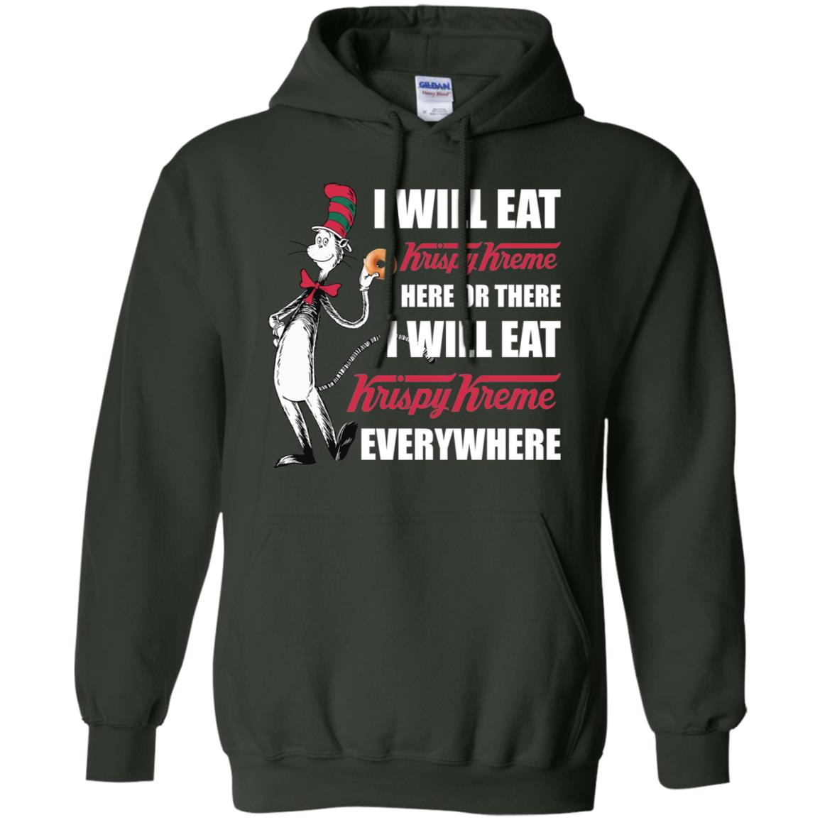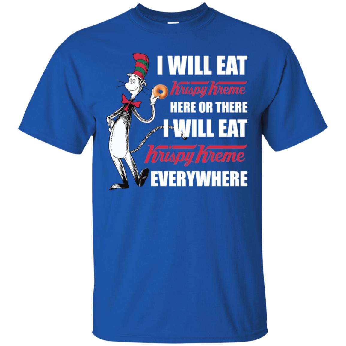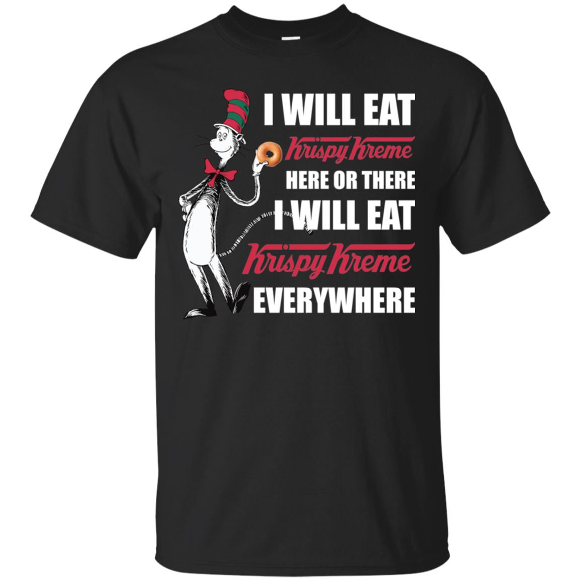 This “I Will Eat Krispy Kreme Here or There, I Will Eat Krispy Kreme Everywhere Shirt” is the perfect item for several groups:* The Dedicated Doughnut Lover: If you consider yourself a true aficionado of Krispy Kreme, this shirt is a must-have addition to your wardrobe. It’s a fun way to express a significant part of your personality (or at least, your snack preferences!).* Searching for a Unique Gift: Know someone who lights up at the sight of a hot sign? This Krispy Kreme Shirt makes an excellent, thoughtful, and humorous gift for birthdays, holidays, or just because. It’s a gift that’s sure to get a smile, especially when paired with a box of their favorite doughnuts.* Anyone Who Enjoys Playful Apparel: Even if they aren’t the *biggest* Krispy Kreme fan (if such a person exists!), the clever phrase and fun design make this shirt an appealing piece of casual wear for anyone with a good sense of humor.Made with comfortable fabric, these shirts are designed for durability and wearability, ensuring your declaration of doughnut devotion lasts as long as your love for the treats themselves.