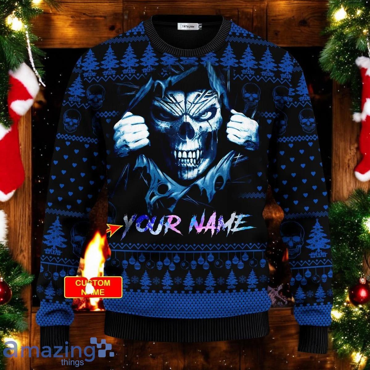 The sweater features a bold and playful design centered around a skull motif adorned with classic Christmas elements. The color palette is a mix of traditional holiday hues – reds, greens, and whites – contrasted with the edgier black and grey of the skull. This juxtaposition creates a visually striking ugly Christmas sweater design that’s both festive and unique. The ability to add a custom name elevates this sweater from a novelty item to a cherished, personalized keepsake.