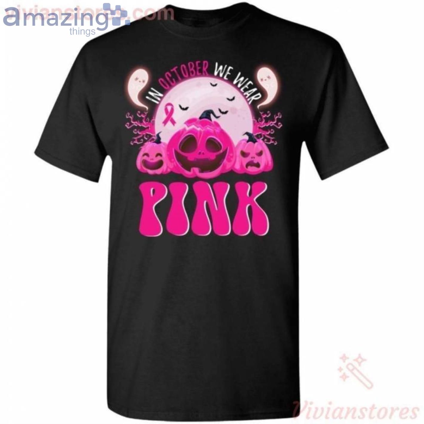 In October We Wear Pink Breast Cancer Pumpkin Halloween T-Shirt Details