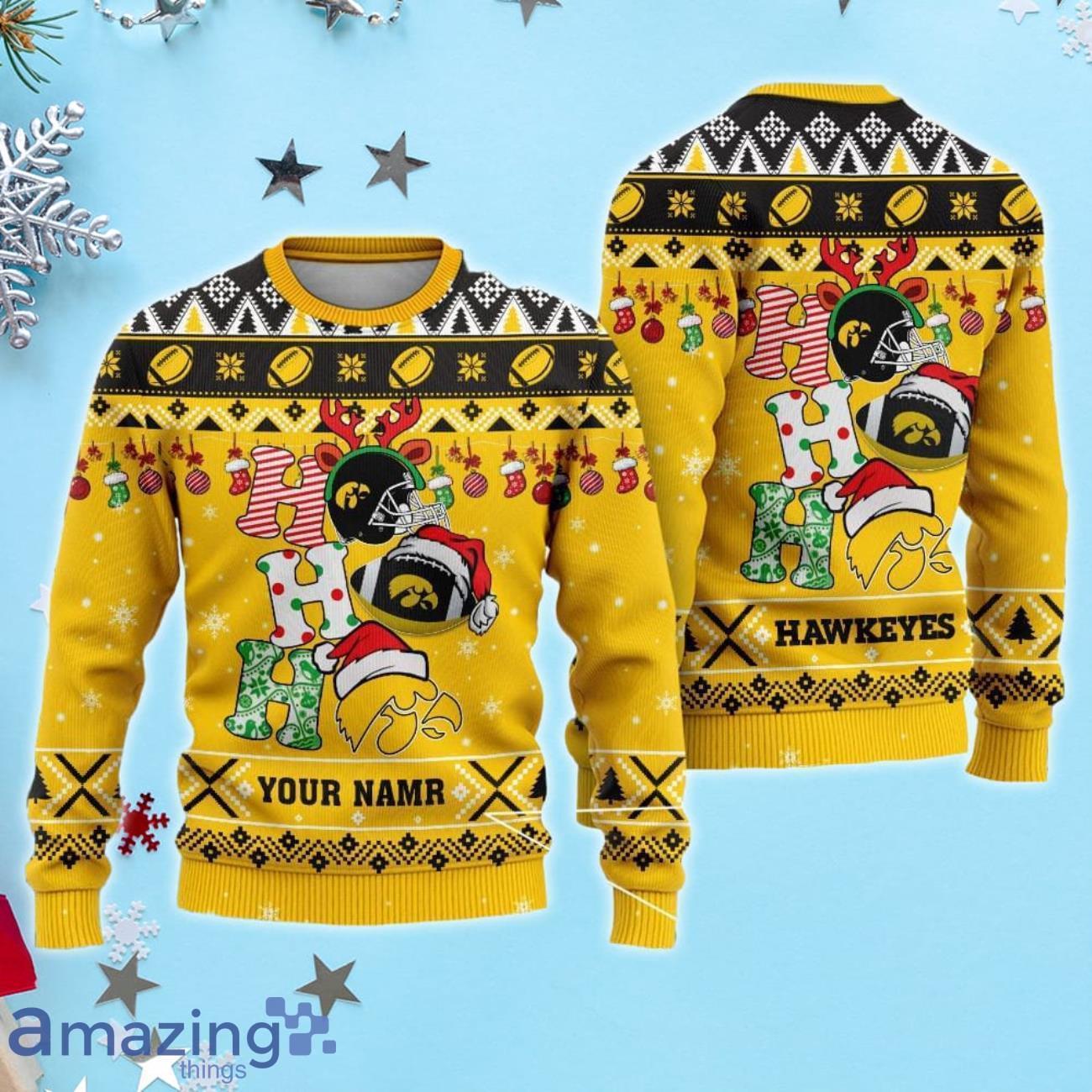 Iowa Hawkeyes Ho Ho Ho Santa’s Reindeer Ugly Christmas Sweater Xmas Gift For Fans Custom Name Informations: