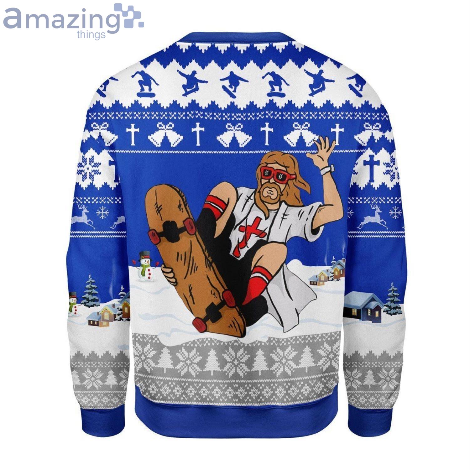For those who appreciate both their faith and the thrill of skateboarding, this sweater offers an unexpected and delightful fusion. Featuring a realistic, eye-catching 3D print, the design depicts Jesus expertly riding a skateboard. It’s a bold and humorous take on the traditional Christmas Ugly Sweater, ensuring you’ll be the center of attention at any holiday gathering.