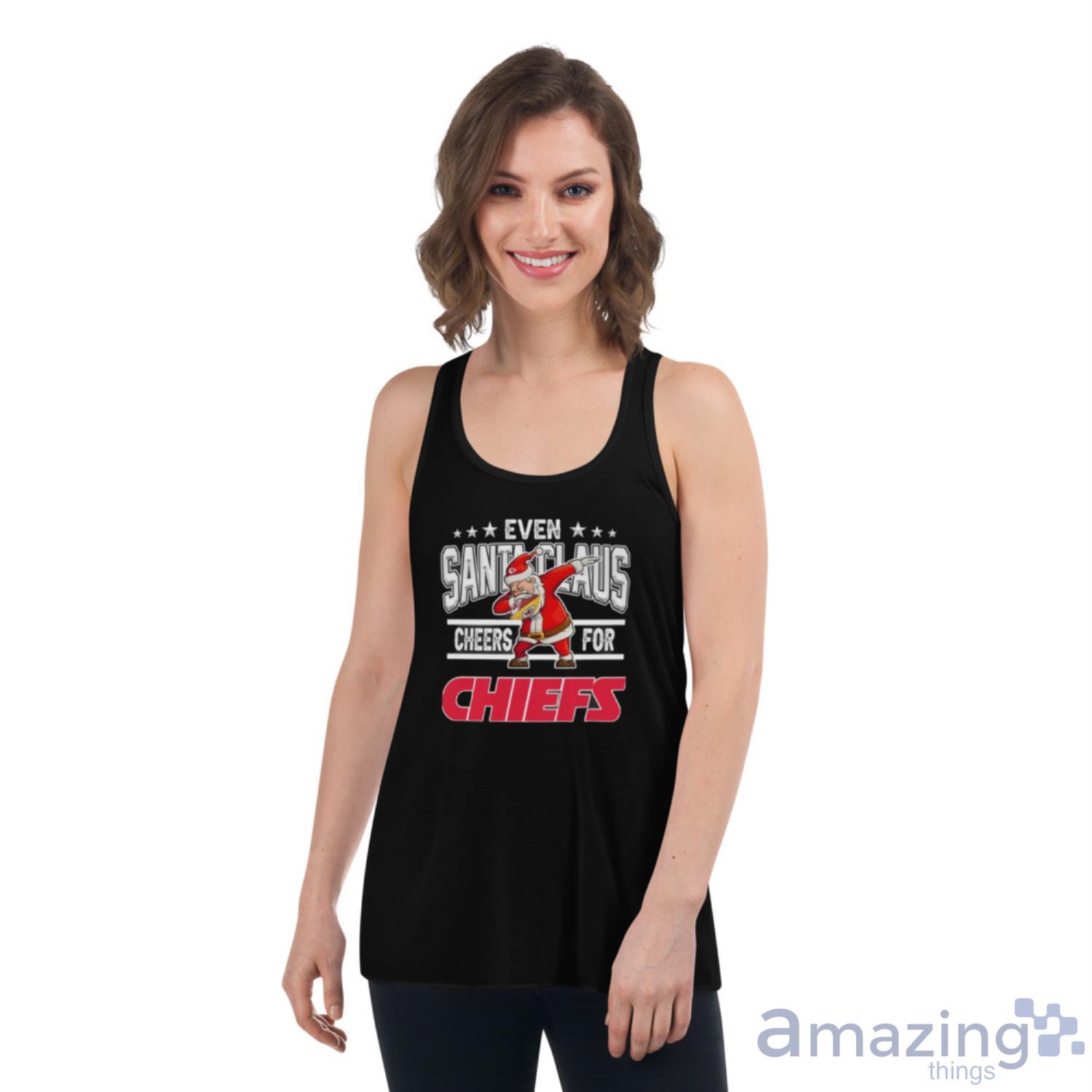 This shirt is perfect for any Kansas City Chiefs fan! It features the team’s logo in the center with “Even Santa cheers for the Chiefs!” written above and below in a festive font. The shirt is red and white, just like Santa’s suit, and would make a great gift for any Chiefs fan in your life!