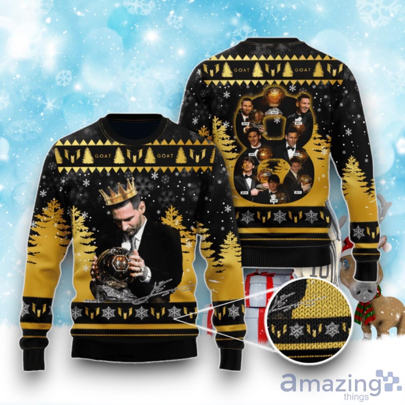 Featuring a unique design that pays homage to Lionel Messi’s incredible achievements, this ugly Christmas sweater is a true celebration of his record-breaking 8 Ballon d’Or wins. The vibrant colors and intricate detailing bring out the festive spirit, making it an eye-catching conversation starter at any holiday gathering.