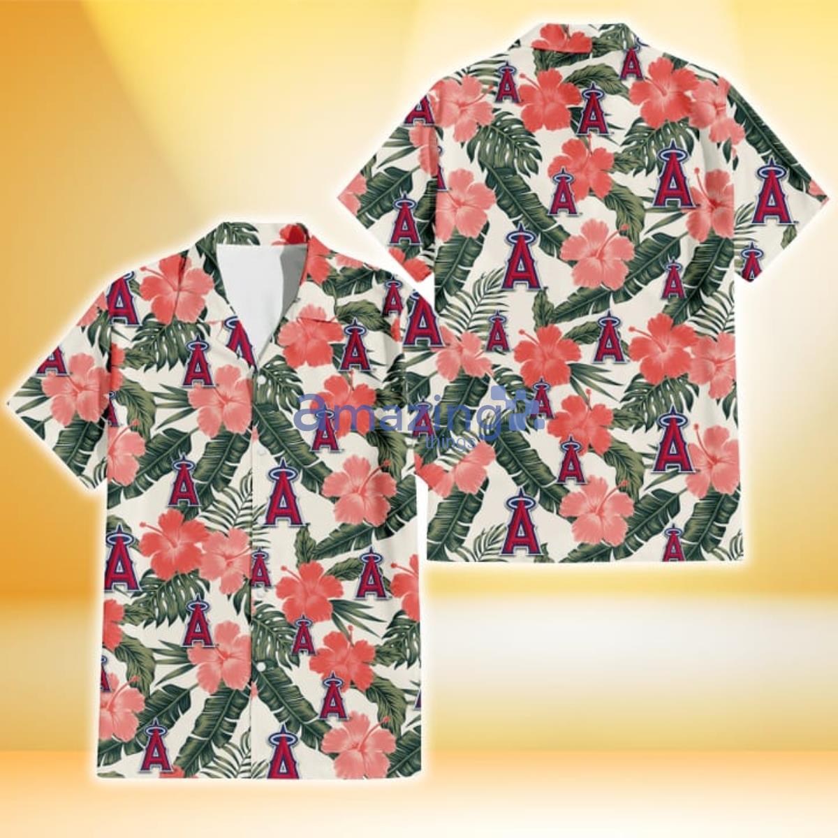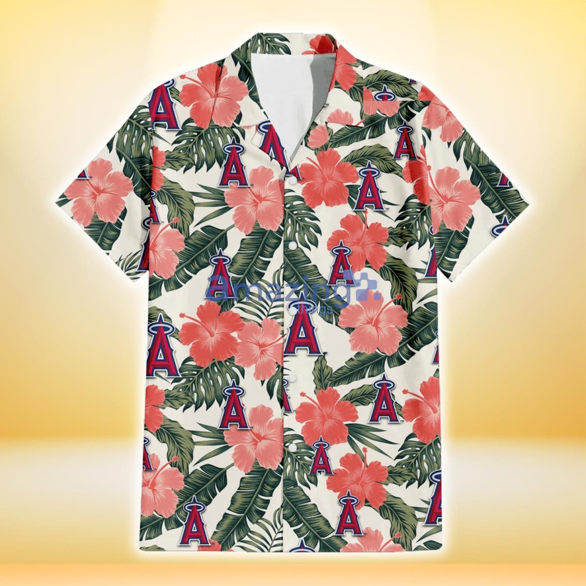 Some of the Los Angeles Angels Pink Coral Hibiscus Banana Leaf Beige Background 3D Hawaiian Shirt photos