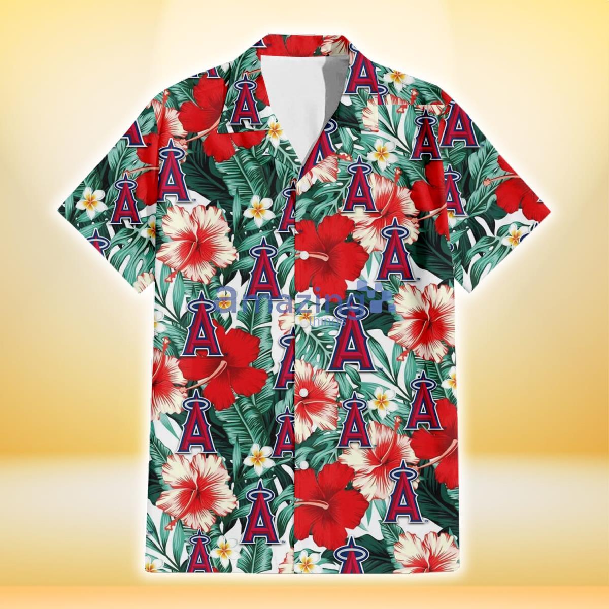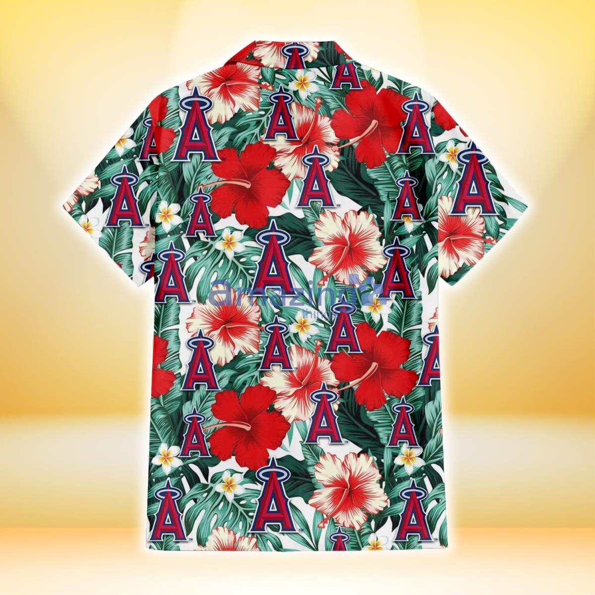 Los Angeles Angels Red Coral Hibiscus White Porcelain Flower Banana Leaf 3D Hawaiian Shirt Details: