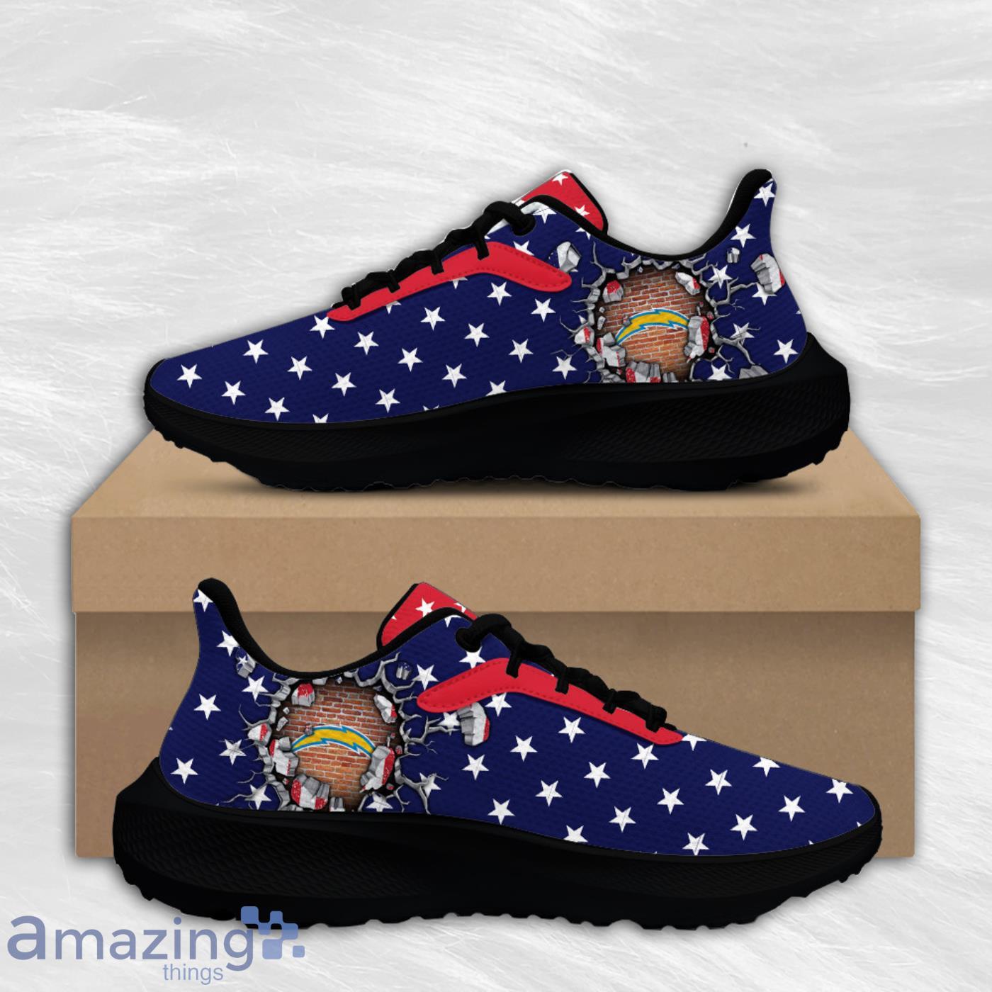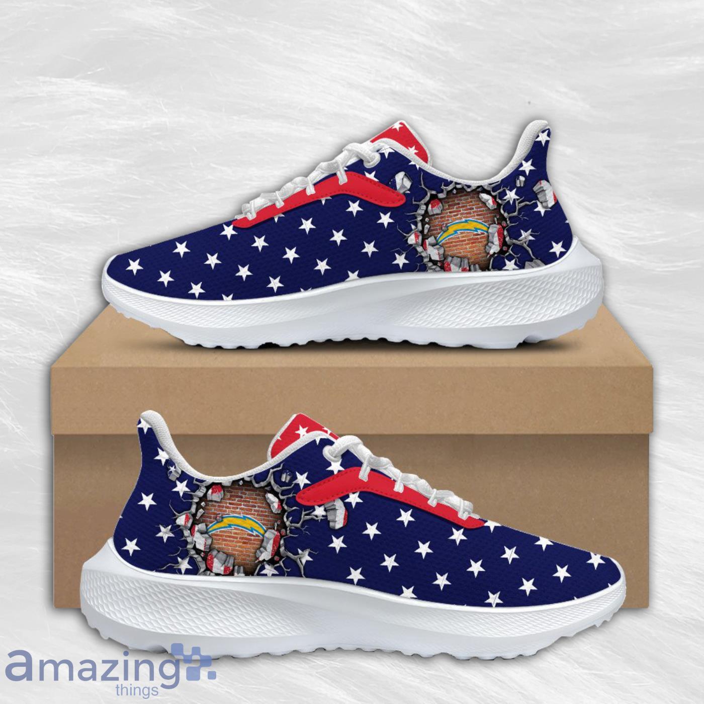 Crafted with high-quality materials, these shoes feature a breathable air mesh upper that keeps your feet cool and fresh during intense workouts or casual strolls. The vibrant American flag design, adorned with the iconic Los Angeles Chargers logo, adds a patriotic touch to your ensemble while proudly displaying your loyalty to your favorite team.