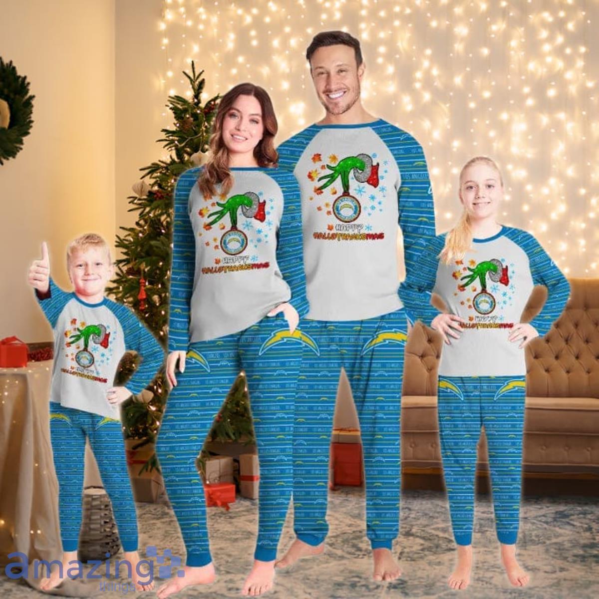 Some of the Los Angeles Chargers Happy HalloThankmas Grinch Pajamas Set photos