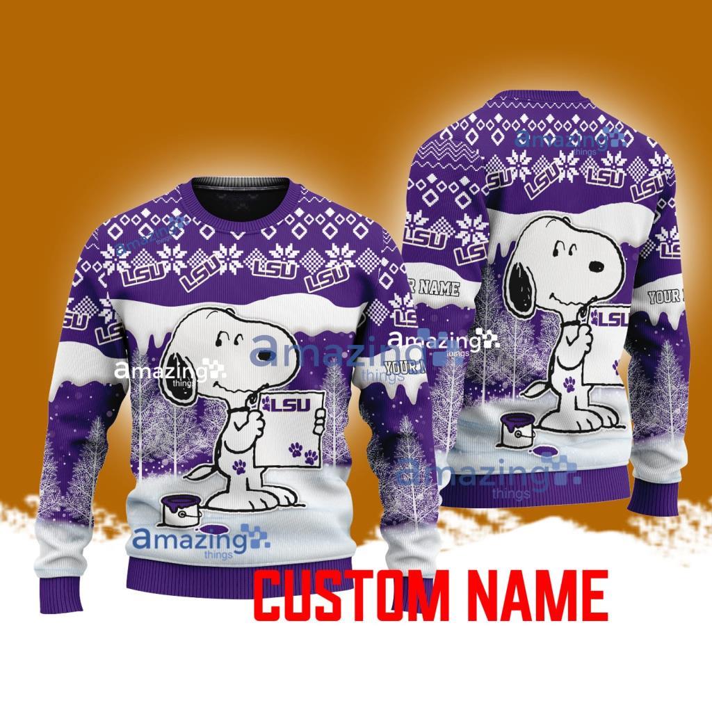 Louisiana State NCAA Snoopy Cute Christmas Ugly Sweater 3D Gift For Fans Custom Name Information