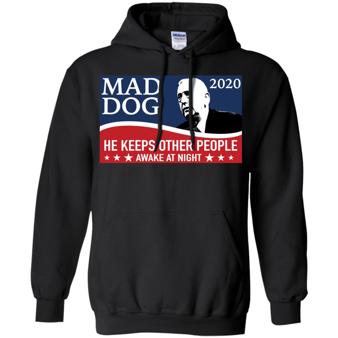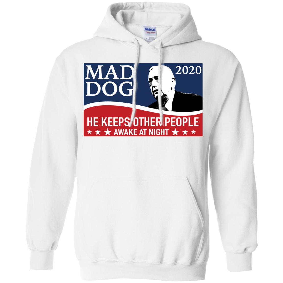 For ultimate comfort and warmth, the hoodies featuring the "Mad Dog 2020 He Keeps Other People Awake At Night" print are an ideal choice. Featuring classic hoodie elements like a drawstring hood and a front pocket, they provide a cozy feel while ensuring your statement is visible. Great for cooler evenings, casual outings, or just lounging in style.