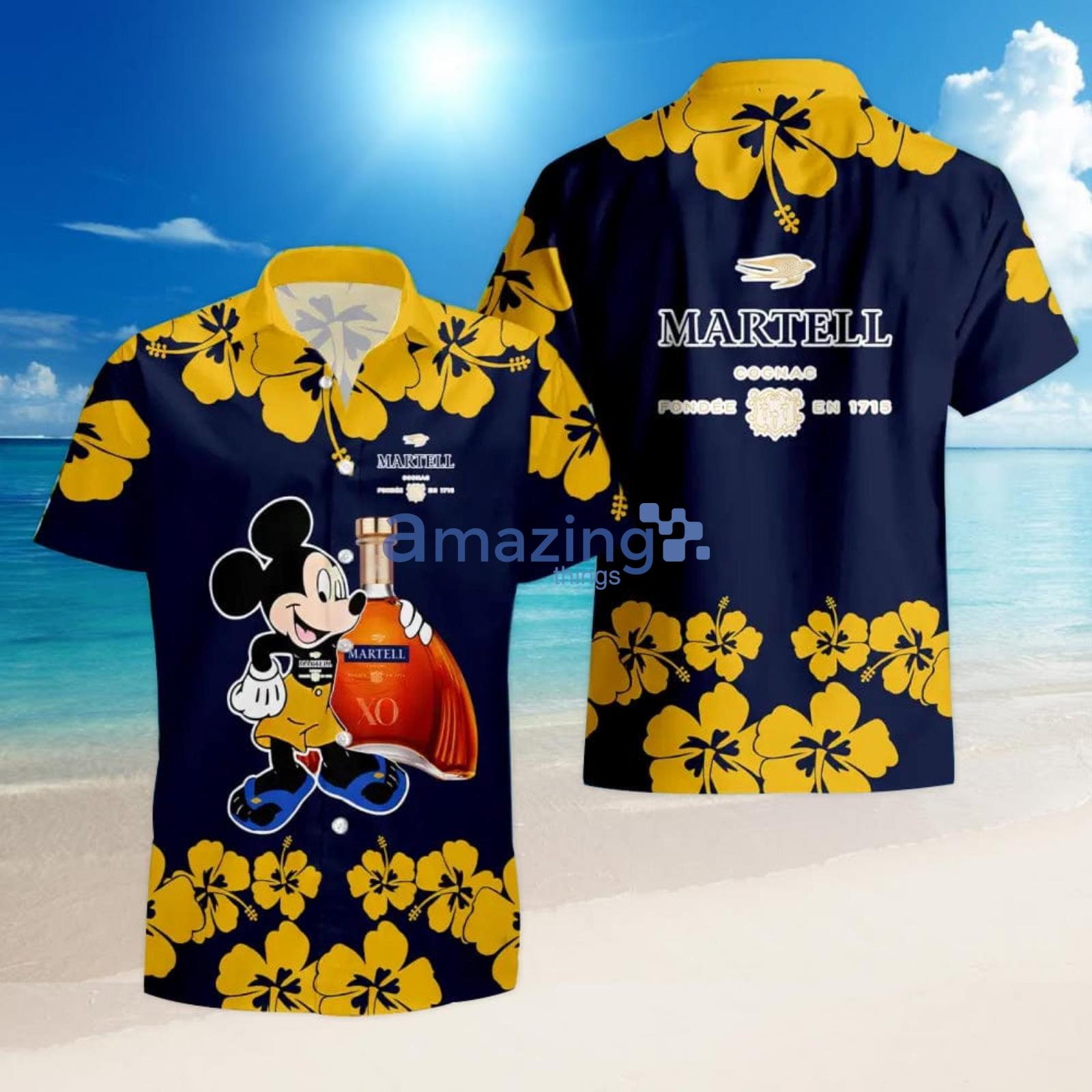 Crafted with utmost attention to detail, our shirt features an eye-catching print of Mickey Mouse enjoying his favorite Martell Cognac, adding a playful touch to your outfit. The vibrant hibiscus flowers beautifully contrast against the deep cognac hue, creating a striking visual appeal.