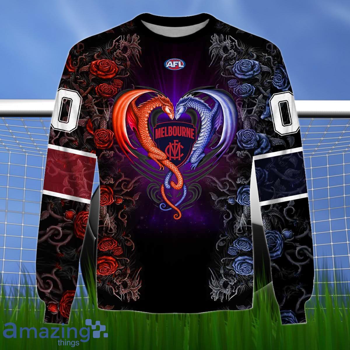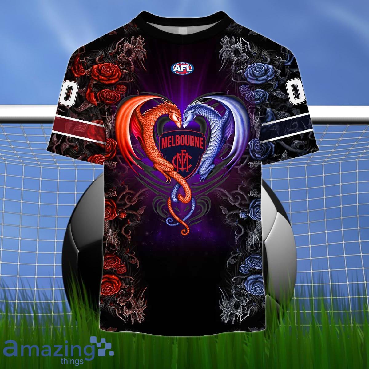 Perfect design for holiday. Get yours this shirt or this is a cute item for your daddy, gift for your mom, and gift for friends on any occasion. buy a cute Melbourne Demons Custom Name And Number Rose Dragon 3D Shirt For Fans now.