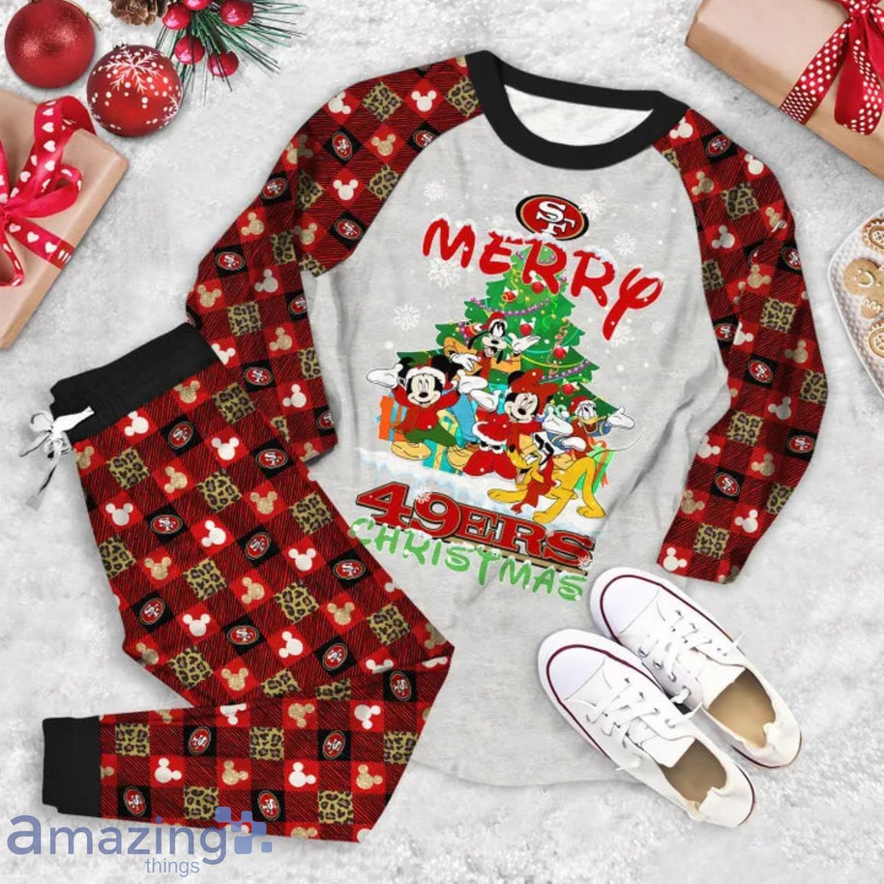 Crafted from high-quality, breathable fabric, these pajamas offer optimal comfort all night long. The vibrant red and gold color scheme, adorned with festive 49ers-themed patterns and logos, will instantly fill your heart with team spirit and holiday cheer.