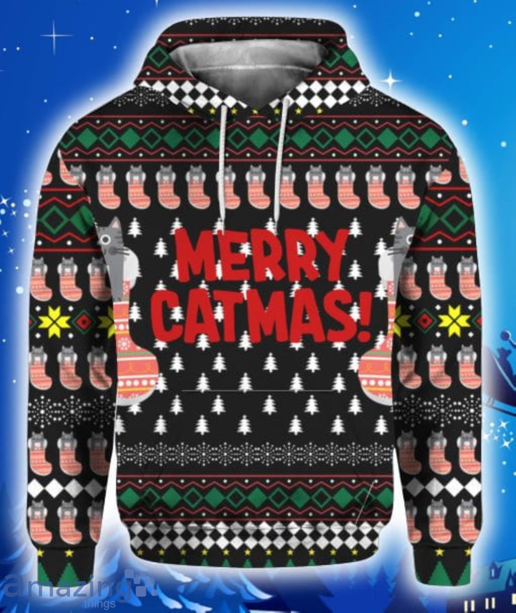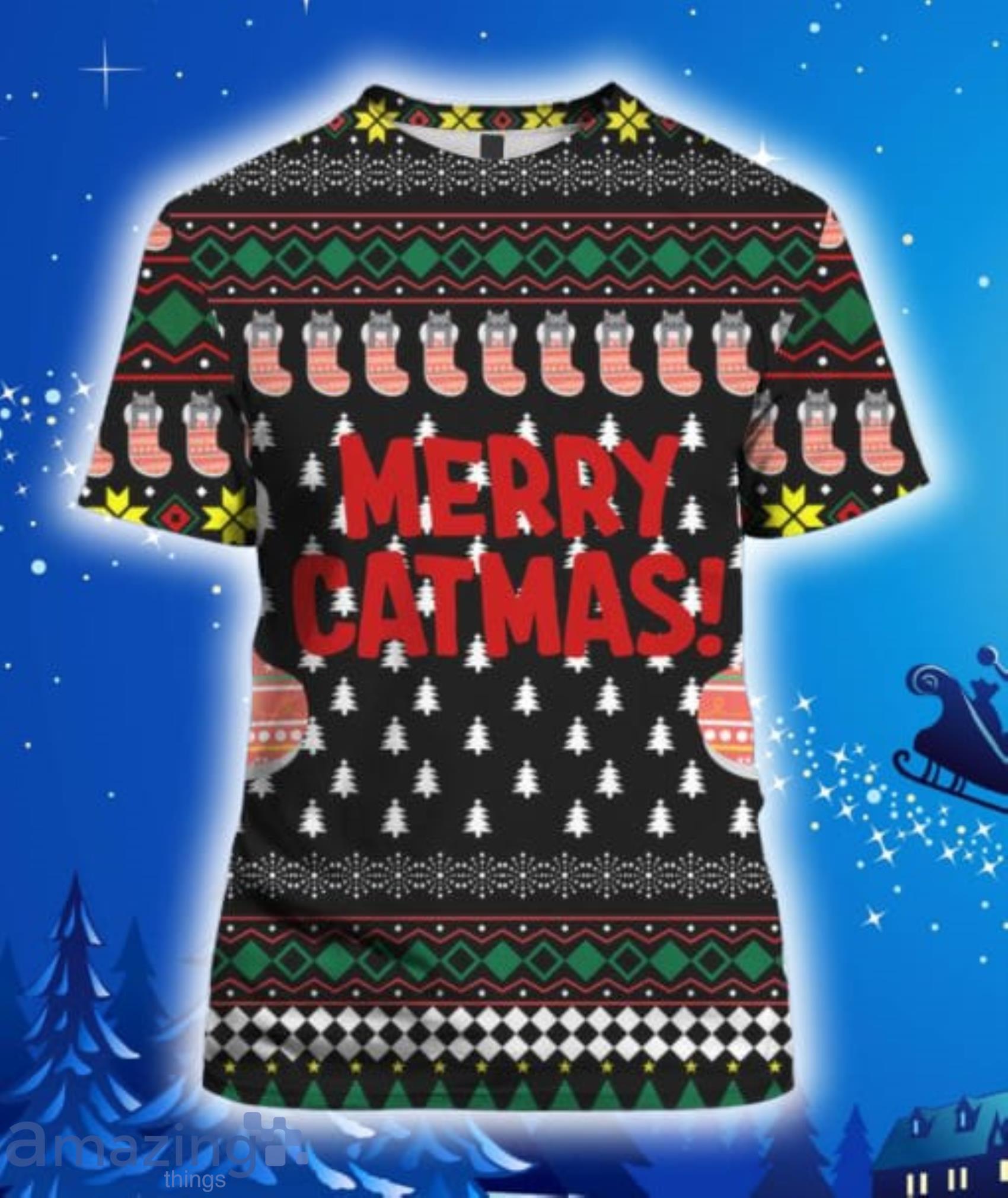 Perfect design for holiday. Get yours this shirt or this is a cute item for your daddy, gift for your mom, and gift for friends on any occasion. buy a cute Merry Catmas Funny All Over Print 3D Hoodie, T-Shirt, Christmas Sweater now.