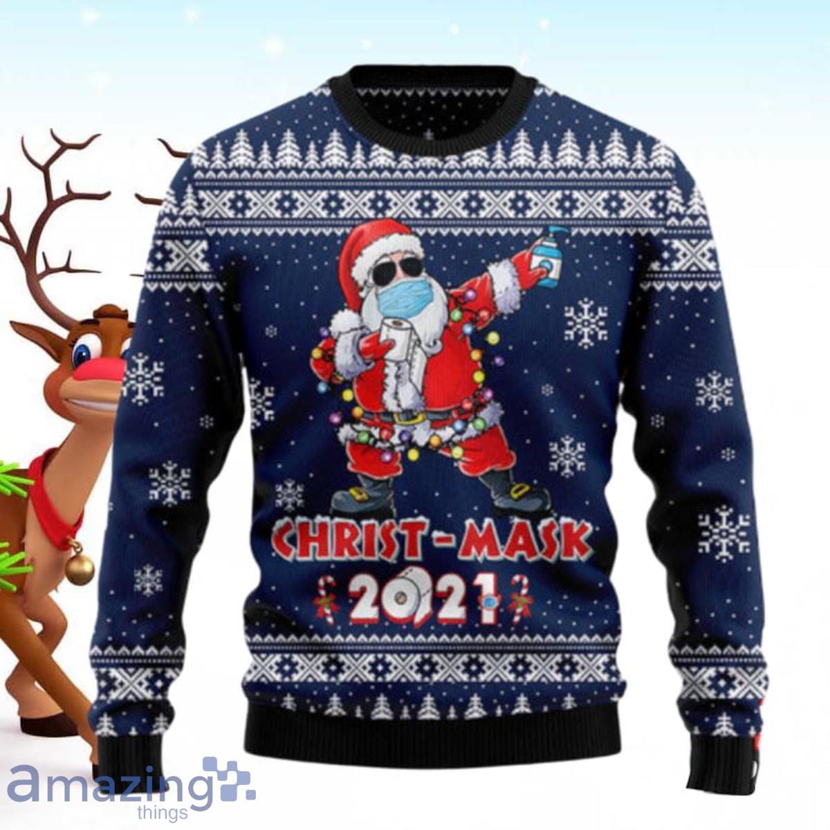 Featuring a cheerful Santa Claus wearing a merry Christ mask, this sweater combines classic Christmas motifs with a modern twist. The intricate details and vibrant colors make it a standout piece that will surely catch everyone’s attention at any holiday gathering.
