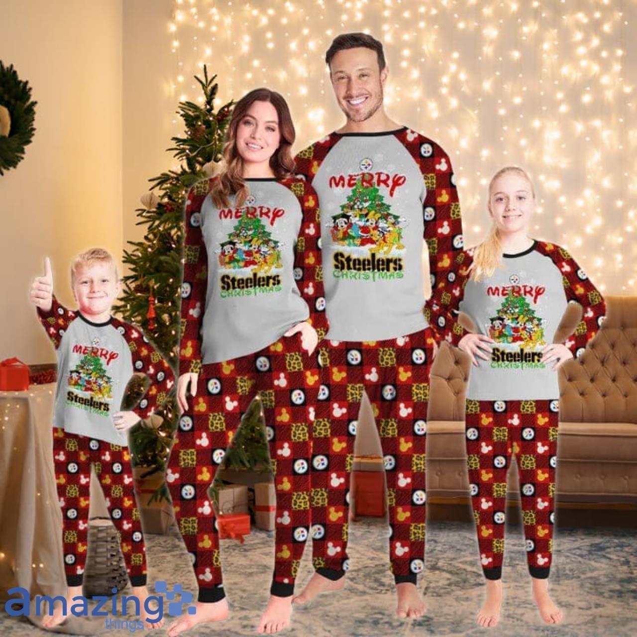 Crafted with utmost care, our pajama set features a comfortable and cozy design that ensures a good night’s sleep. The top is adorned with a vibrant and cheerful “Merry Steelers Christmas” print, capturing the essence of the holiday spirit with a touch of team pride. The bottoms complement the top perfectly, completing the look with an all-over Steelers logo pattern.