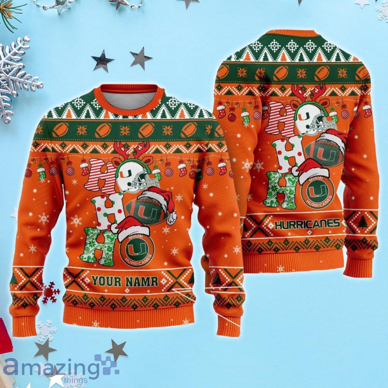 Miami Hurricanes Ho Ho Ho Santa’s Reindeer Ugly Christmas Sweater Xmas Gift For Fans Custom Name Informations: