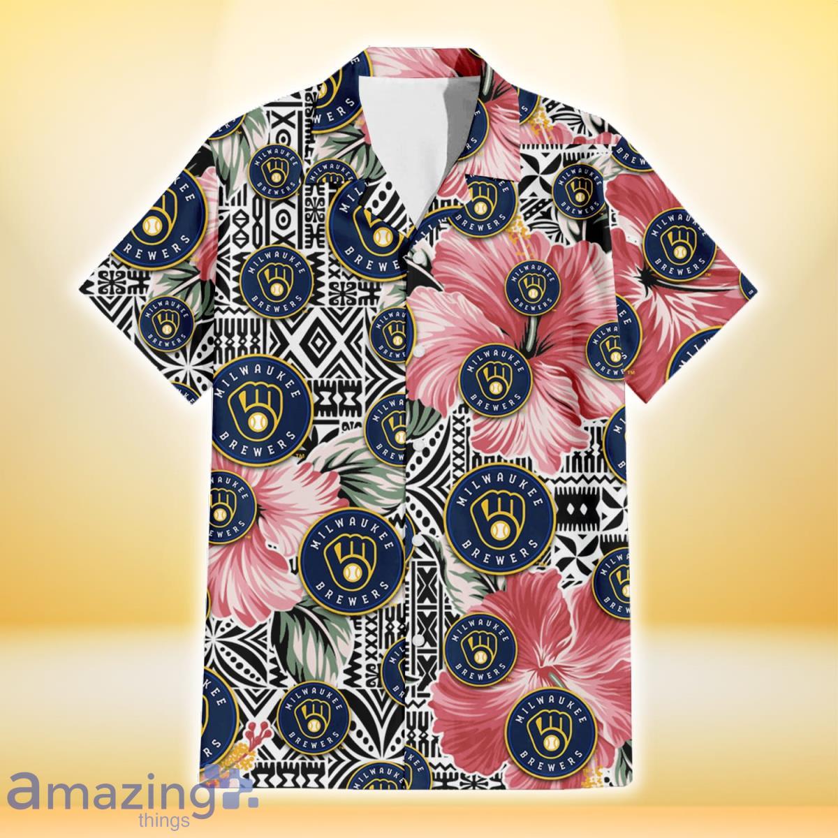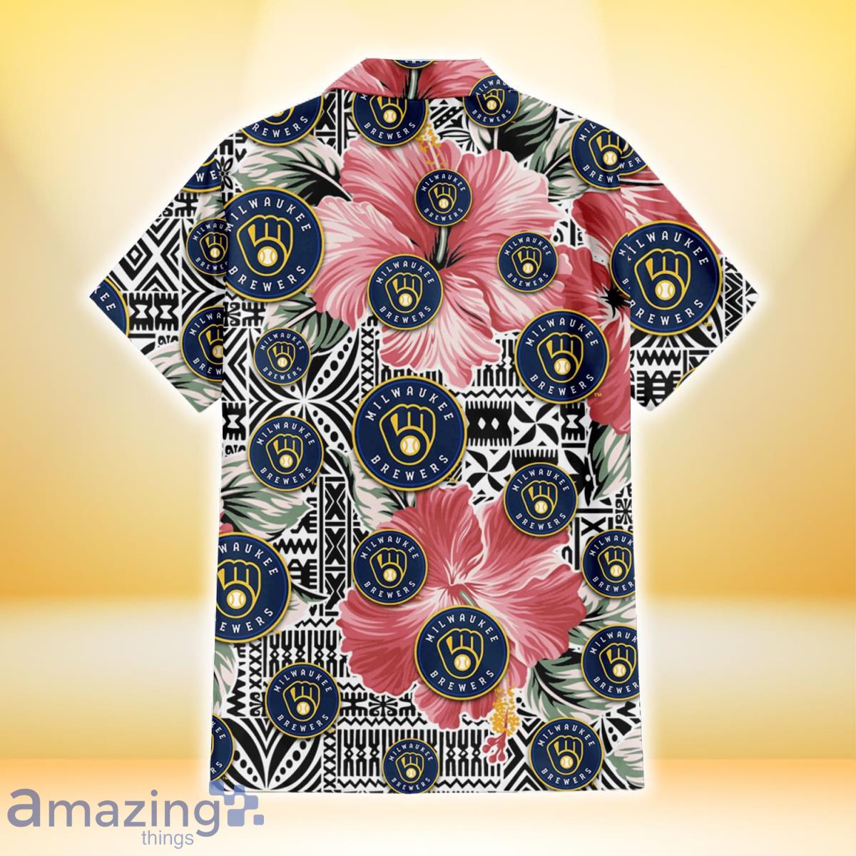 Some of the Milwaukee Brewers Pink Hibiscus Black Pattern White Background 3D Hawaiian Shirt Gift For Fans photos
