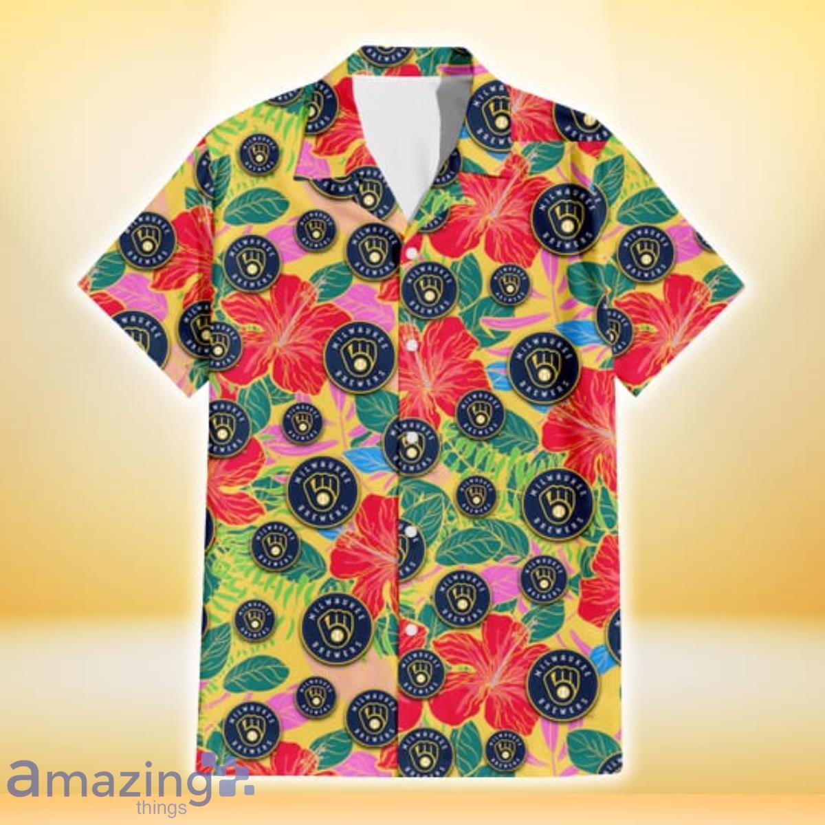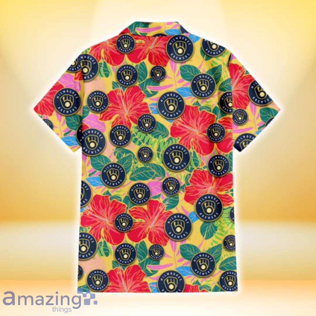 Some of the Milwaukee Brewers Red Hibiscus Green Blue Leaf Yellow Background 3D Hawaiian Shirt Gift For Fans photos