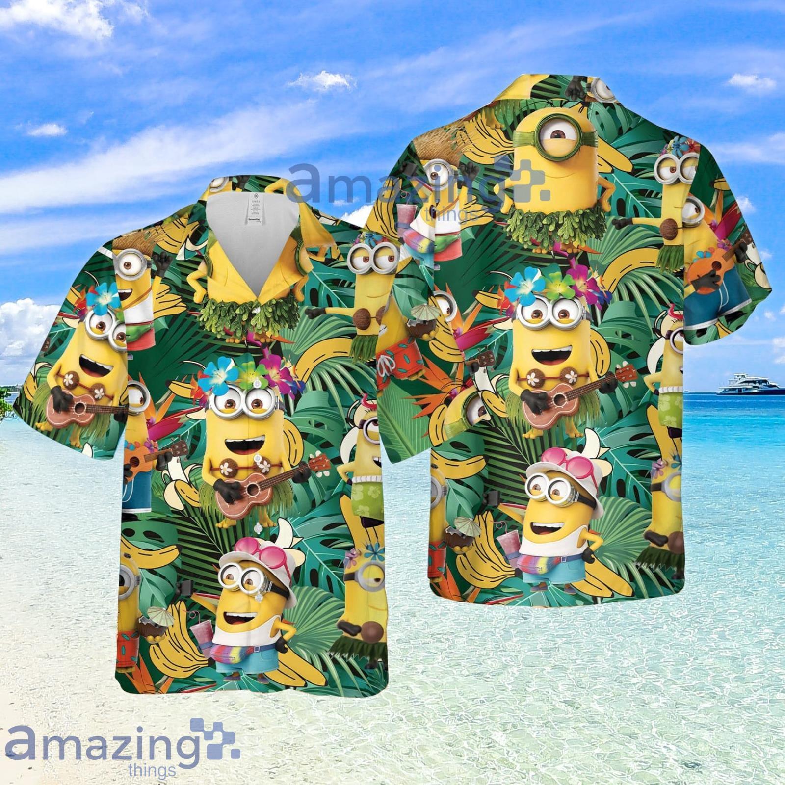 The Hawaiian shirt features a vibrant print of the beloved Minions and their favorite fruit – the banana. The bright yellow background and green leaves add a tropical touch to the design, making it perfect for beach parties, luaus, or any summer celebration. The shirt is made from a lightweight and breathable fabric, ensuring that you stay cool and comfortable all day long.