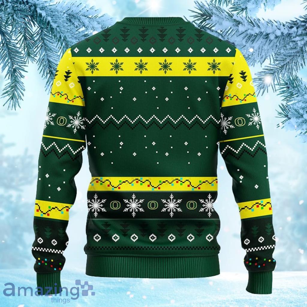 The sweater features a bold 3D design of the Oregon Ducks mascot, with Santa Claus dabbing in the center. The vibrant green and yellow color scheme represents the team’s colors, making this sweater a great way to show off your fandom while staying cozy and warm.
