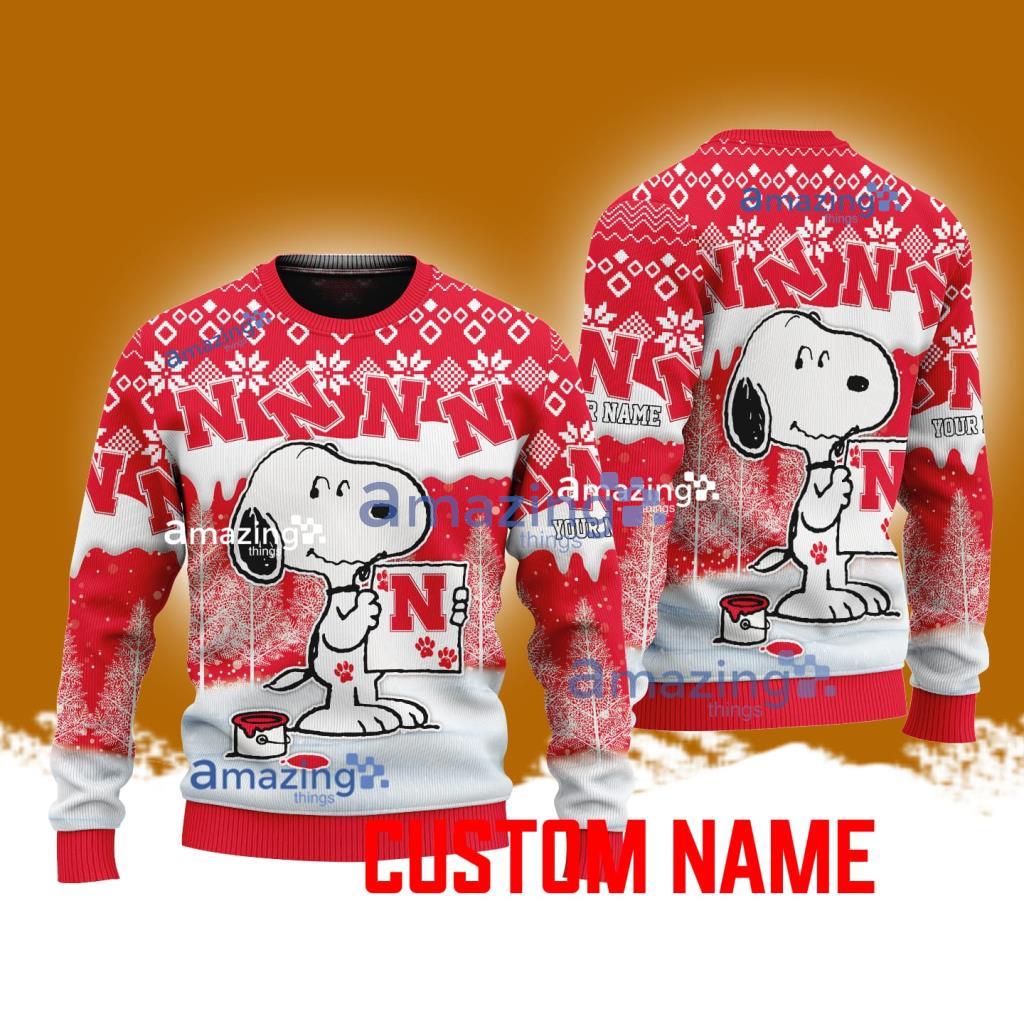 Nebraska Cornhuskers NCAA Snoopy Cute Christmas Ugly Sweater 3D Gift For Fans Custom Name Information