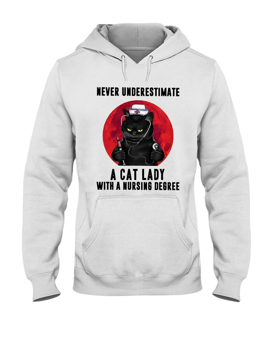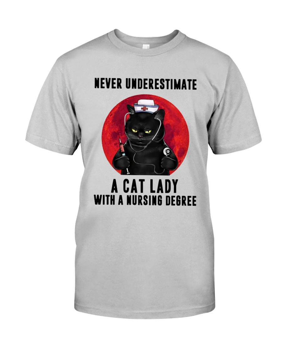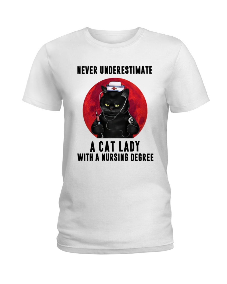 Celebrating the Dedicated Spirit: The “Never Underestimate A Cat Lady With A Nursing Degree Black Cat Shirt”