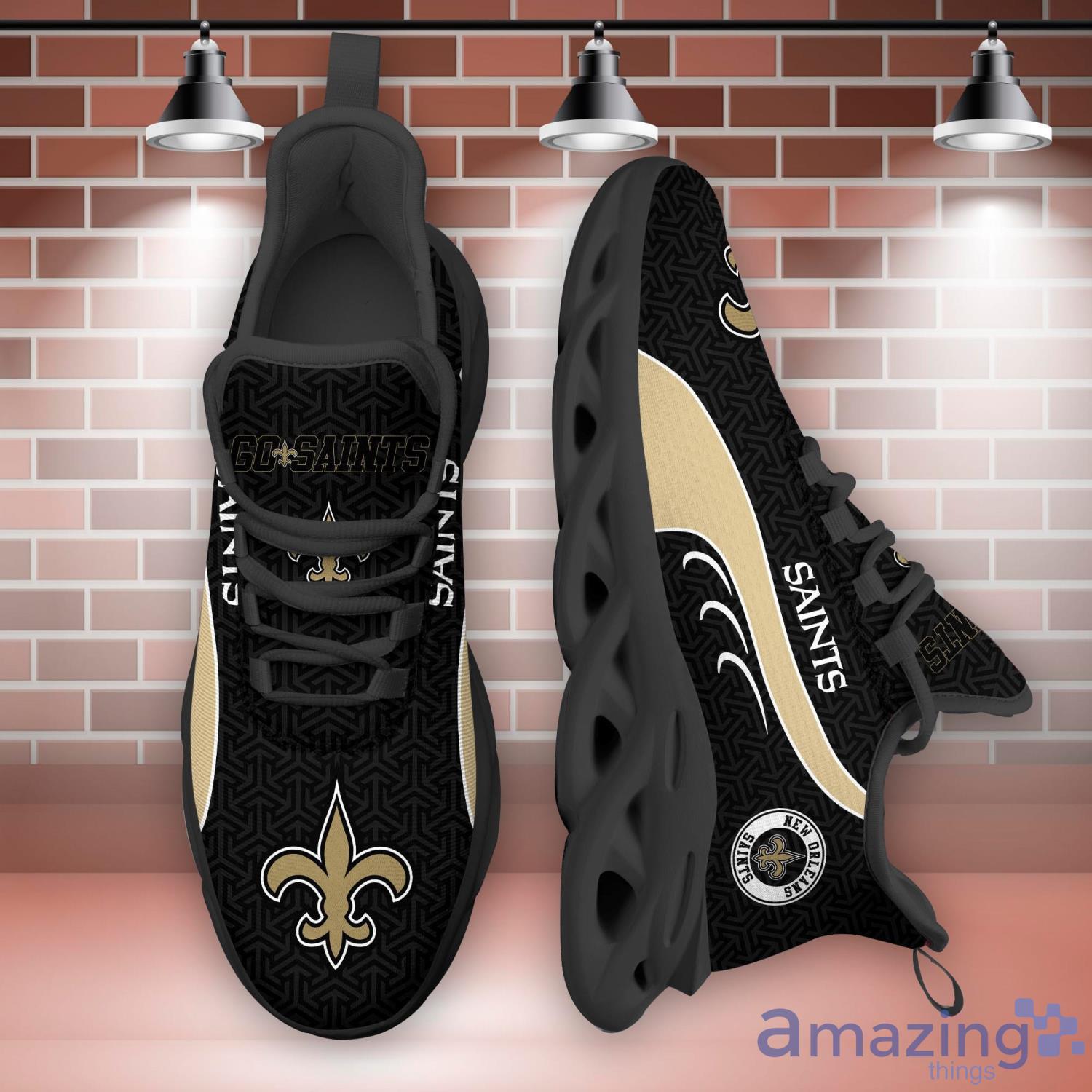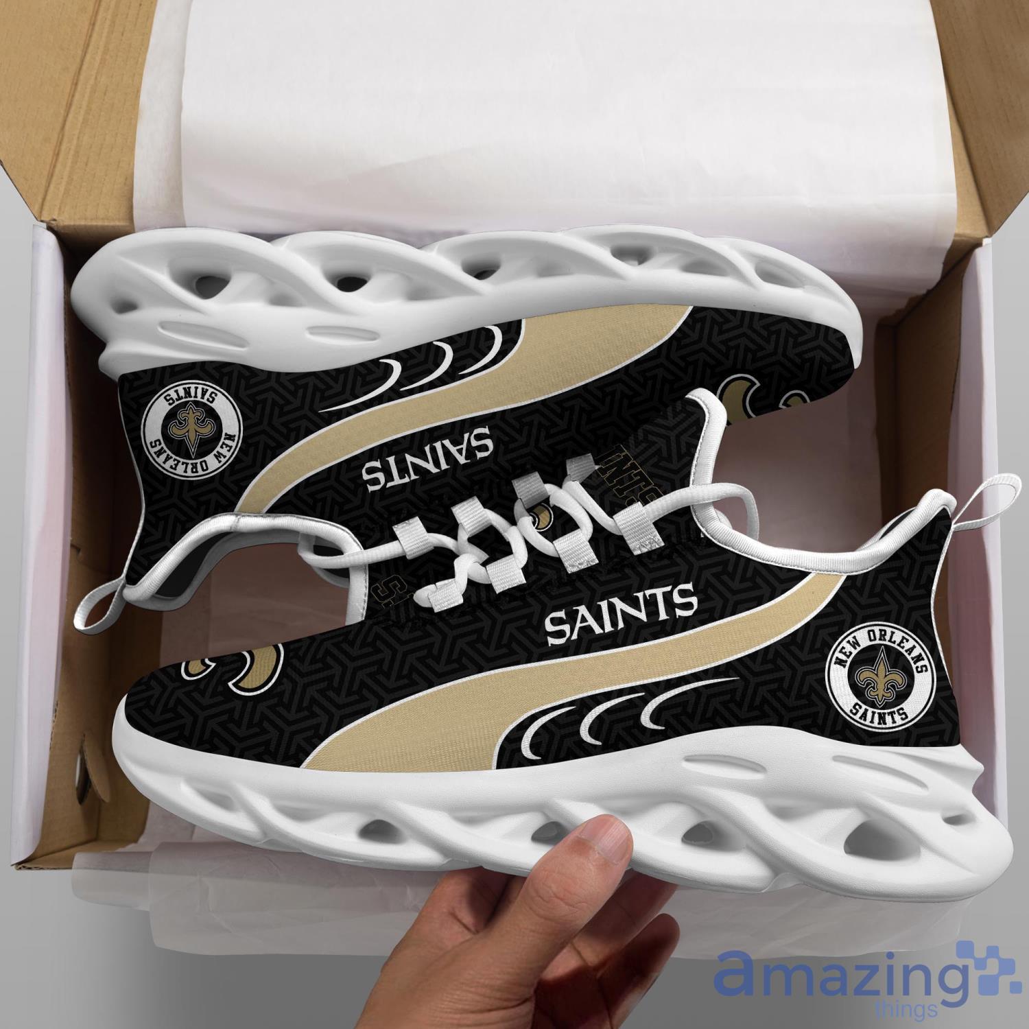 This New Orleans Saints NFL Clunky Shoes Sport Fans Gift Men And Women Max Soul Sneakers is a breathable, lightweight, and comfortable casual outdoor shoe that has a unique design. It is made of a mesh fabric which makes it sweat absorbent and breathable, while the rubber bottom ensures traction, comfort, and durability. It is available in two colors: black or white sole. There are two styles of shoelace holes so you can choose your preference.
