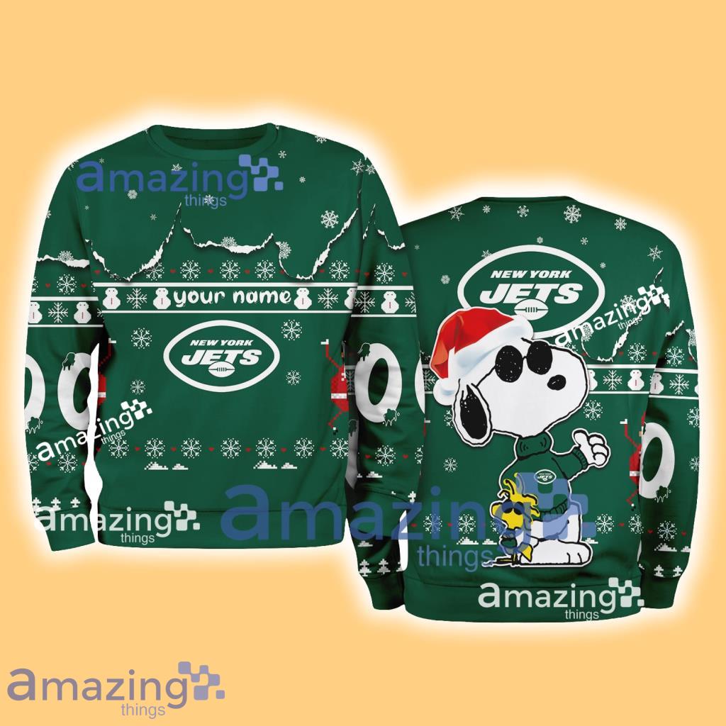 Get into the holiday spirit in style with the New York Jets NFL Snoopy and Woodstock Cute Personalized Number Christmas Ugly Sweater! This limited edition sweater is the perfect way to show off your team pride while getting festive with everyone’s favorite Peanuts characters. With a personalized number on the back, this sweater is completely unique to you. Don’t miss out on this new gift that is sure to be a hit at all your holiday gatherings. Order yours today and spread some cheer with Snoopy
