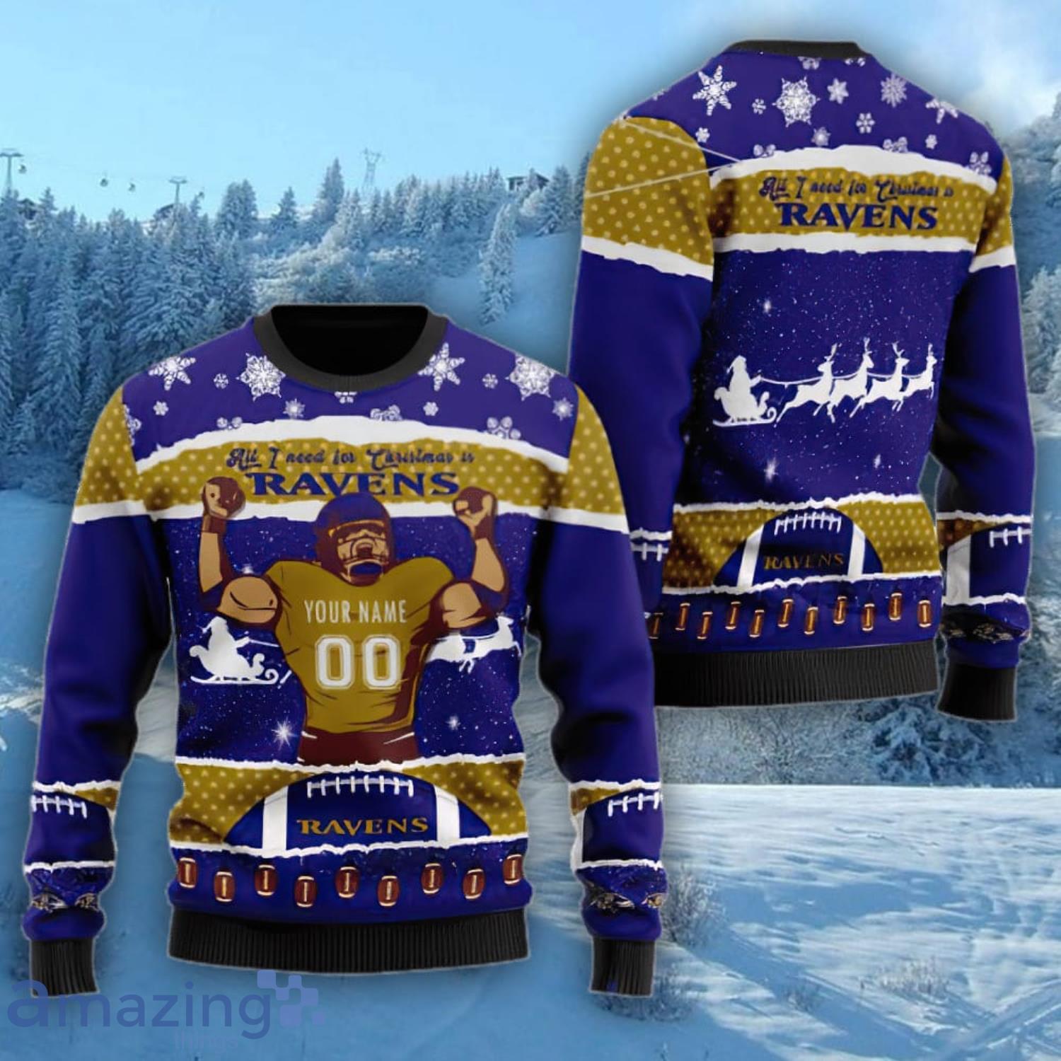 NFL Baltimore Ravens Custom Name And Number 3D Ugly Christmas Sweater Christmas Gift For Sport Fans Information
