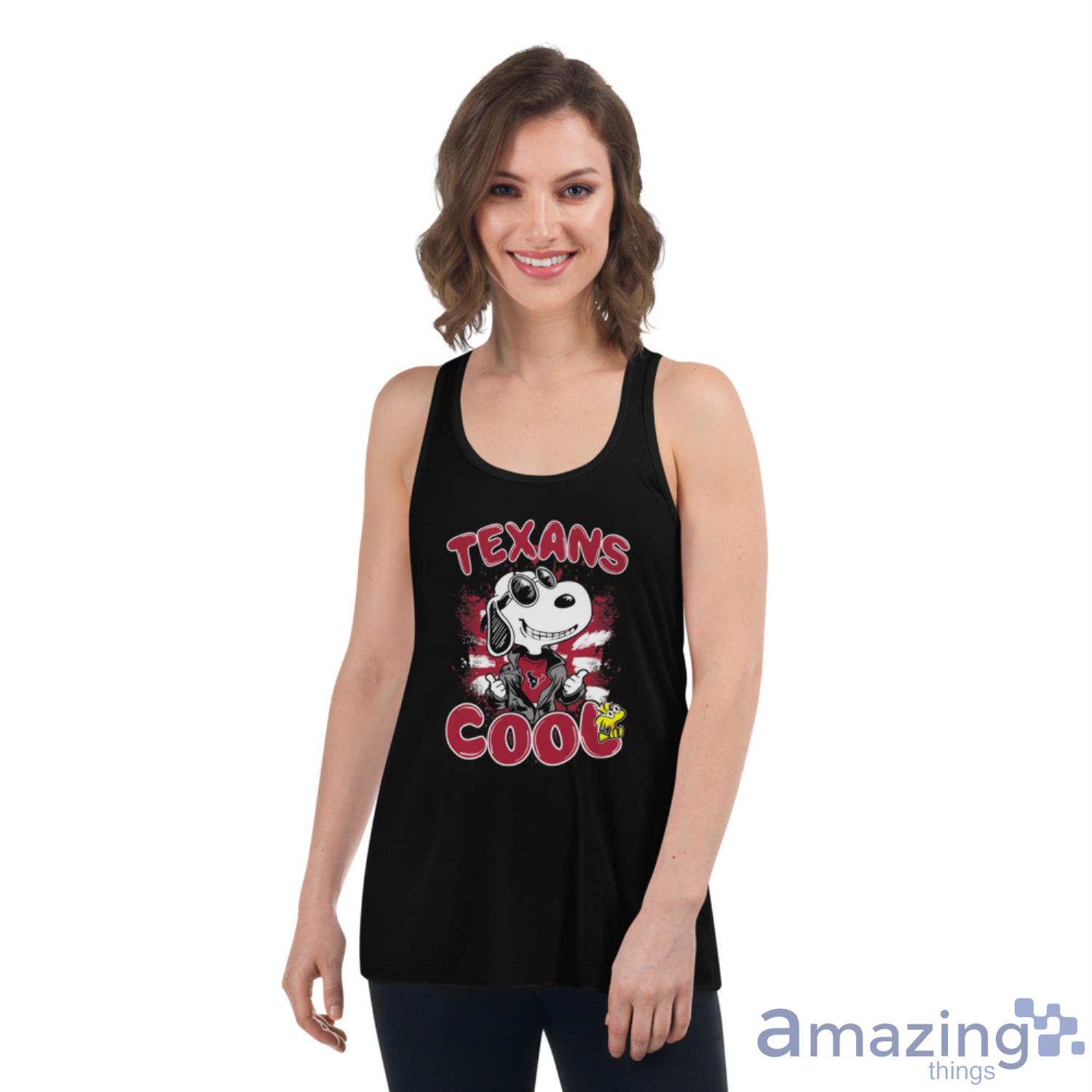 The design of the shirt is both stylish and fun. The front of the shirt features a large print of Snoopy wearing a Houston Texans jersey and helmet, which is sure to turn heads and spark conversations. This shirt is perfect for game day or any occasion where you want to show off your love for the Texans and Snoopy.