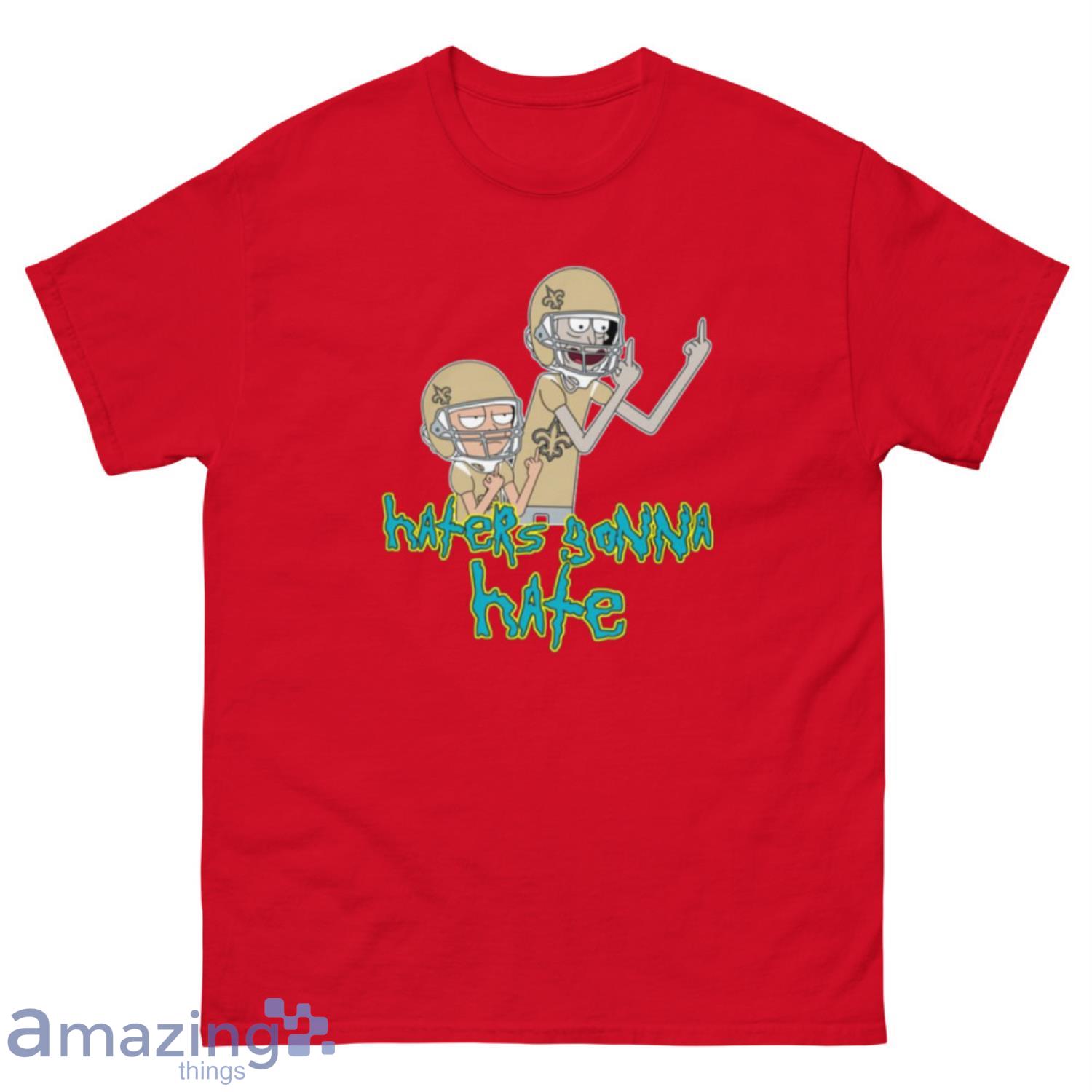 This one-of-a-kind shirt is the perfect way to show off your love for both the Saints and Rick and Morty. The shirt features the iconic Saints logo with a twist – Rick and Morty are front and center, surrounded by the phrase “Haters Gonna Hate”. It’s a fun and playful design that is sure to turn heads and get people talking.