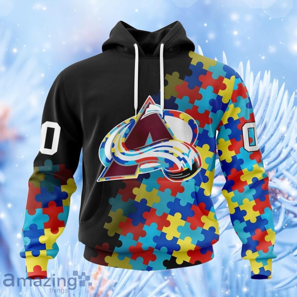 Show your support for the NHL Colorado Avalanche and raise awareness for autism with this special black hoodie featuring a unique 3D all-over print design. This hoodie is the perfect gift for both men and women who love hockey and want to make a difference. Stay warm and stylish while making a statement with this eye-catching hoodie. Order now and show your support in style!