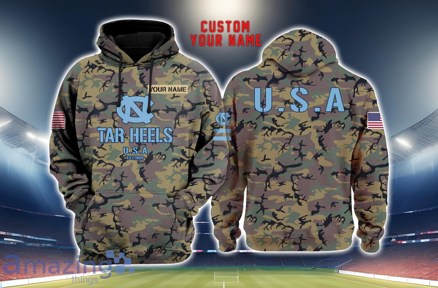 Gear up for game day with the North Carolina Tar Heels 3D Printing Army Camo Pattern Unisex Hoodie Custom Name For Fans! Show off your team pride in style with this unique and customizable hoodie. Made with high-quality materials, this hoodie is perfect for any Tar Heels fan looking to stand out from the crowd. Whether you’re at the game or just out and about, this hoodie is sure to turn heads. Don’t miss out on the opportunity to rep your team in a one-of-a-kind way. Order yours today!