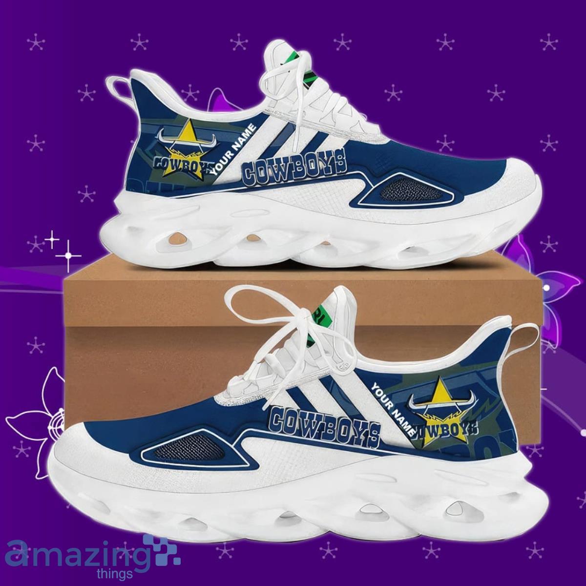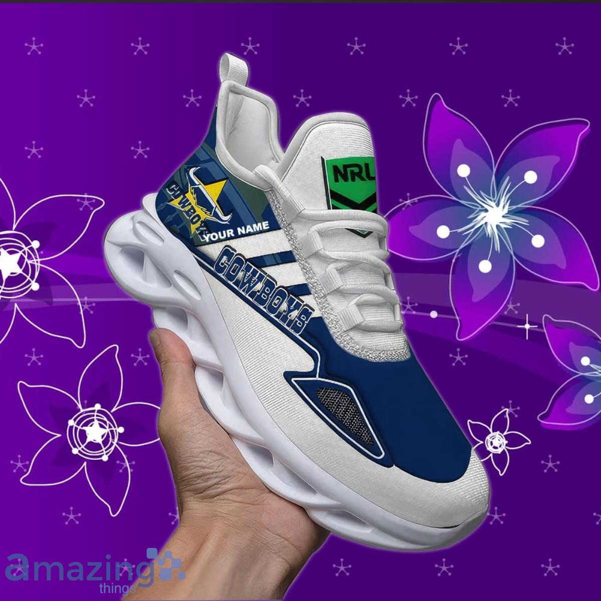 This North Queensland Cowboys NRL Max Soul Custom Name Style Gift Men And Women For Fans is a breathable, lightweight, and comfortable casual outdoor shoe that has a unique design. It is made of a mesh fabric which makes it sweat absorbent and breathable, while the rubber bottom ensures traction, comfort, and durability. It is available in two colors: black or white sole. There are two styles of shoelace holes so you can choose your preference.