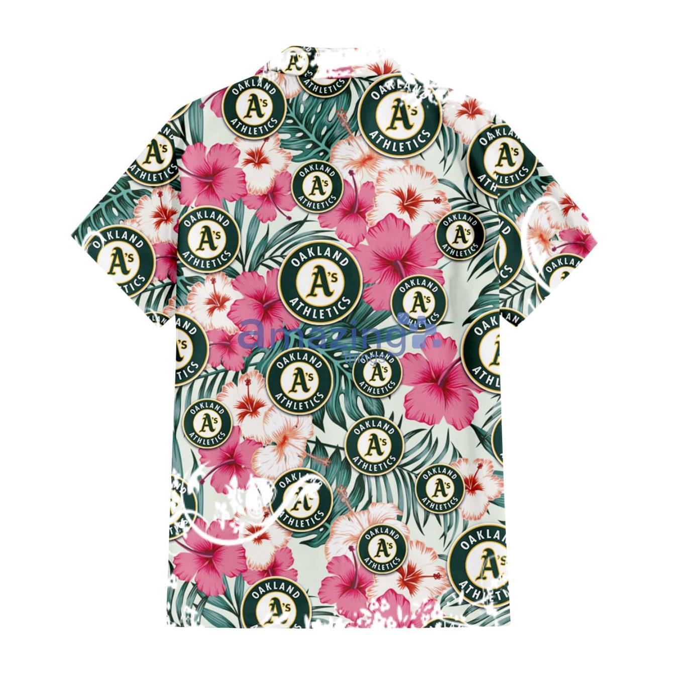 Some of the Oakland Athletics Coral Pink Hibiscus Green Leaf Beige Background 3D Hawaiian Shirt Gift For Fans photos