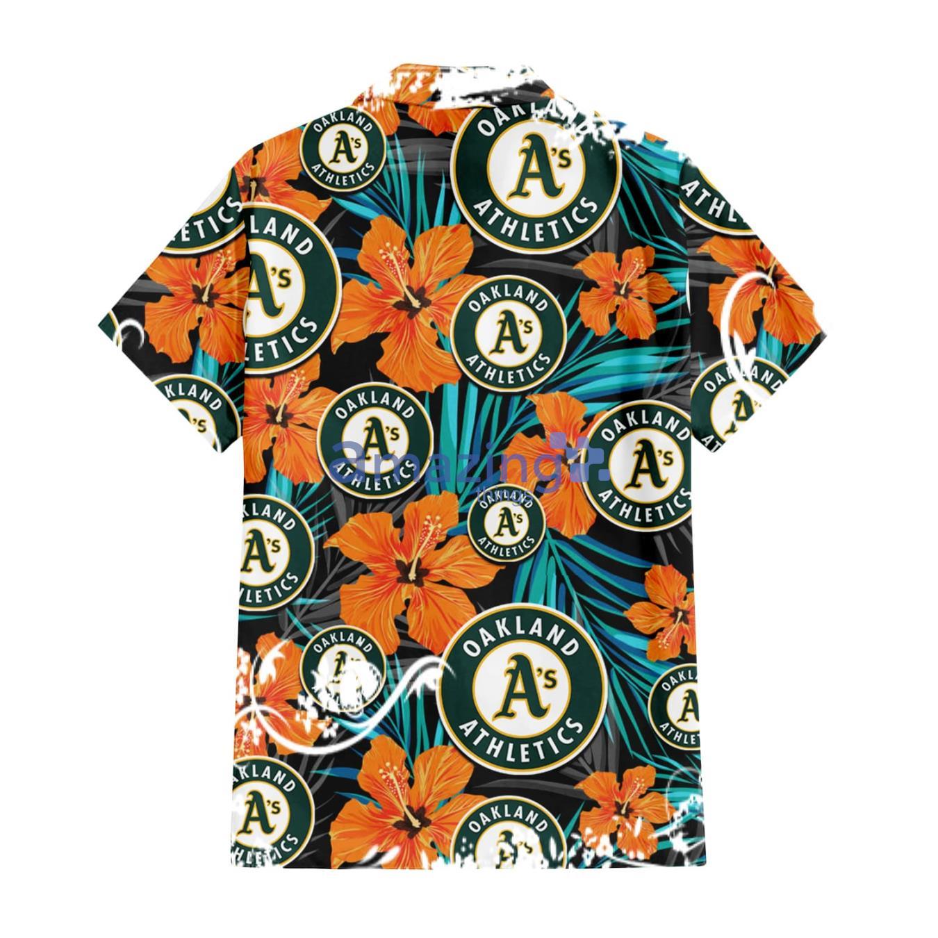 Some of the Oakland Athletics Orange Hibiscus Blue Gray Leaf Black Background 3D Hawaiian Shirt Gift For Fans photos