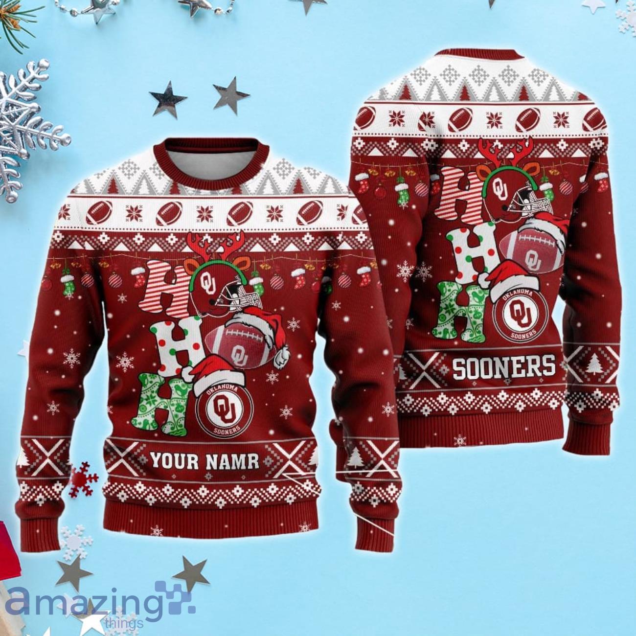 Oklahoma Sooners Ho Ho Ho Santa’s Reindeer Ugly Christmas Sweater Xmas Gift For Fans Custom Name Informations: