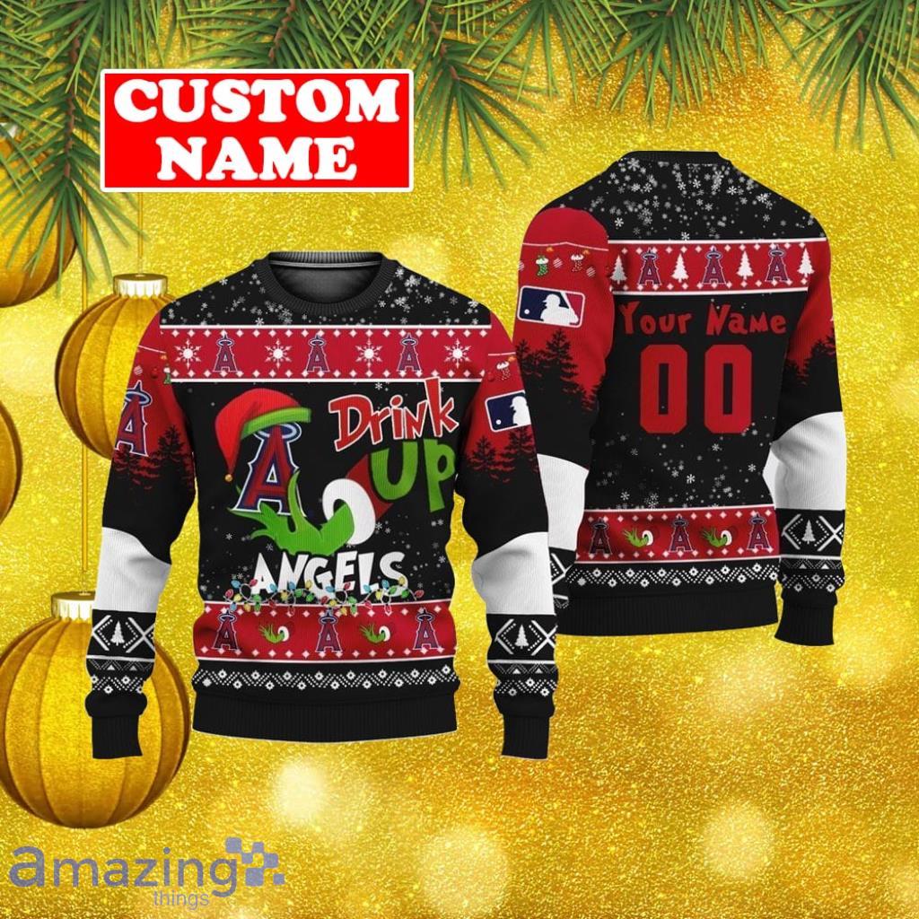 Personalized Name And Number MLB Los Angeles Angels Ugly Christmas Sweater Grinch Drink Up Gift For Men And Women Informations: