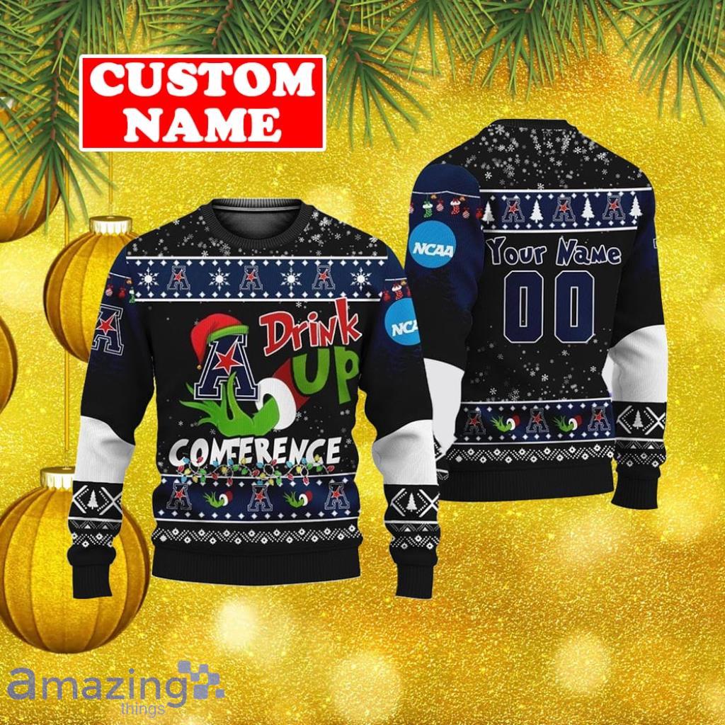 Personalized Name And Number NCAA American Athletic Conference Ugly Christmas Sweater Grinch Drink Up Gift For Men And Women Informations: