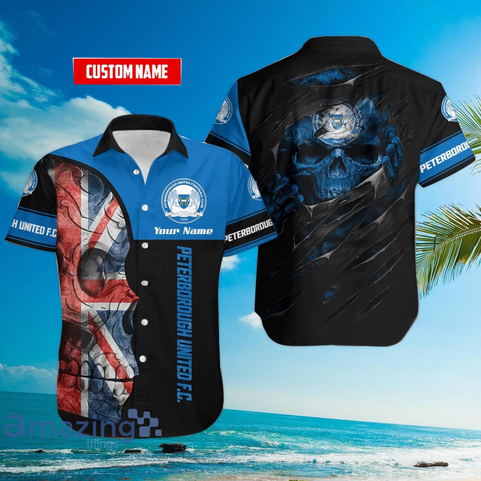 Some of the Peterborough United F C Flag Skull Custom Name 3D Hawaiian Shirt For Fans photos